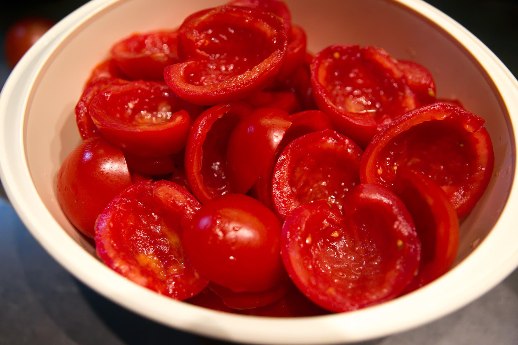 Из помидоров сорта «Сливка», нарезанных на половинки и четвертинки, удалили плодоножки и семена.