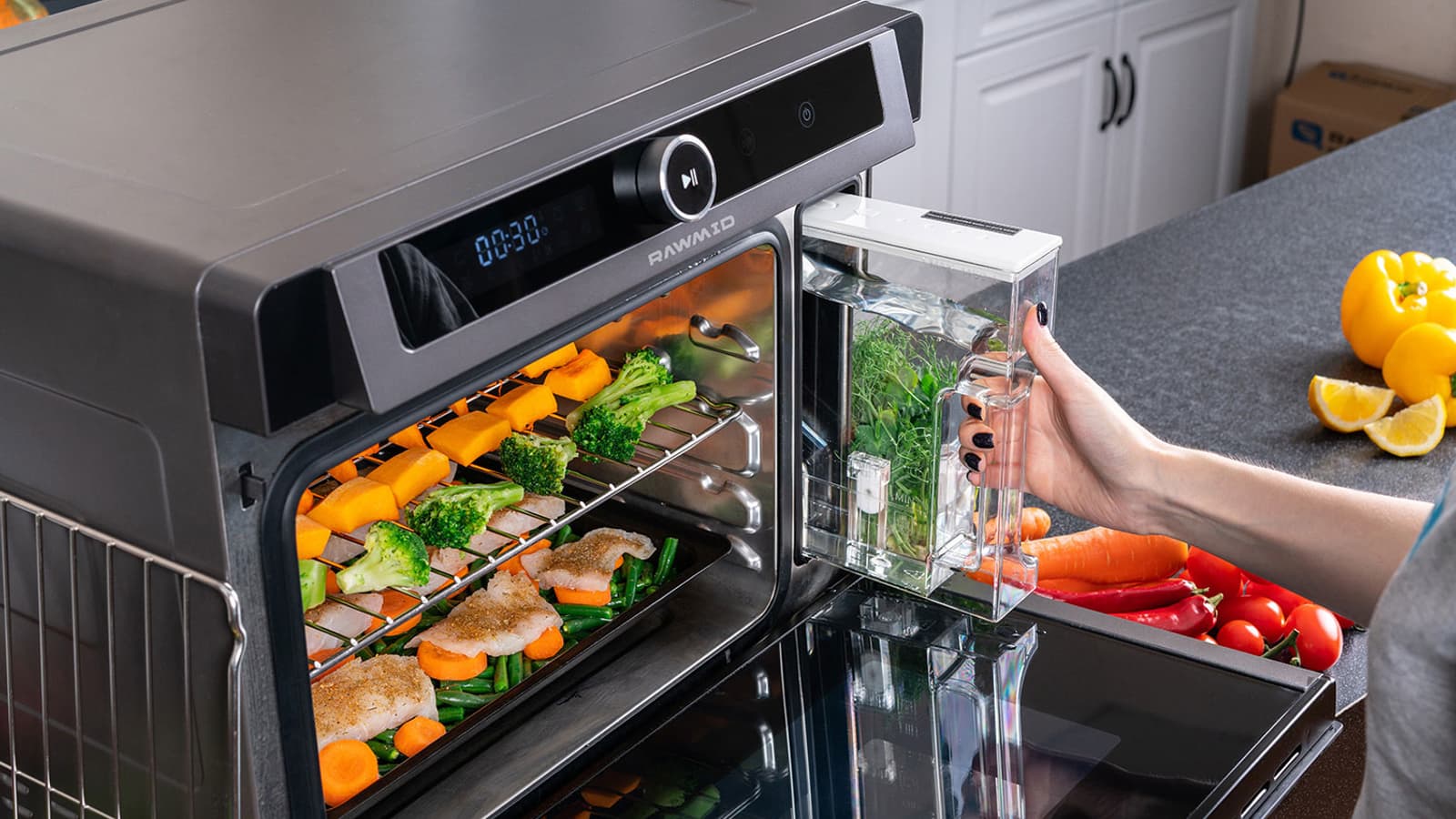 Пароконвектомат — конвекционная печь с функцией приготовления на пару́. Это практически профессиональное оборудование. Небольшие пароконвектоматы используют в кафе и минипекарнях, большие — на предприятиях, в кондитерских и цехах для выпечки. Они гарантируют высокое стабильное качество приготовления, широту использования и отличный результат. Вместе с тем, конвекционная печь с функцией пара — достаточно дорогое устройство, цена которого легко может составлять 100 тысяч рублей. Компания Rawmid представила на рынке новинку 2021 года — печь Future RFM-01, имеющую функции профессиональных пароконвектоматов, но значительно более доступную по цене. У нее современный дизайн, есть более 30 автоматических программ, электронное управление и возможность комбинирования функций аэрофритюрницы, гриля и пропаривания. Тестируем, изучаем, разбираемся в отличиях от обычного духового шкафа.
