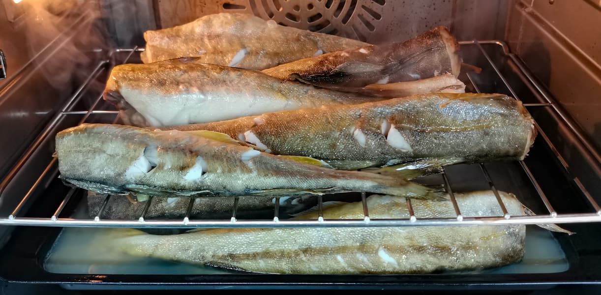 Мы взяли крупную размороженную морскую рыбу, посолили, выложили в 2 ряда — на решетку и на поддон. Выставили режим «рыба на пару́», после завершения программы, так как рыбы мы положили много, добавили еще 15 минут на пару́.