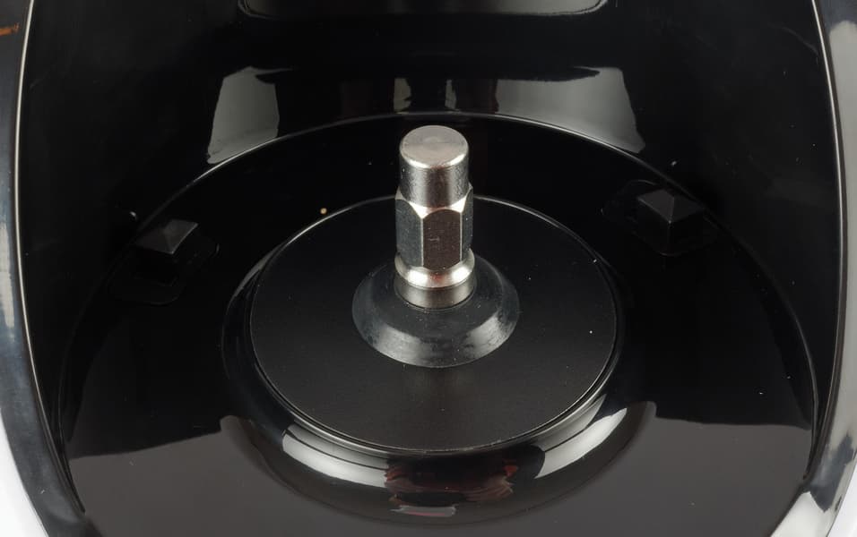 Привод шнека, выступающий из моторного блока, — внушительно выглядящий стальной шестигранник. Верхняя часть соковыжималки закрепляется на корпусе с помощью четырех фиксаторов на байонетном принципе. Крепление имеет некоторый люфт, однако, как показал опыт дальнейшей эксплуатации, он не сказывается ни на удобстве обращения с прибором, ни на его потребительских качествах.