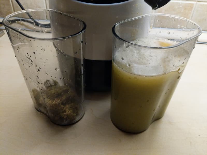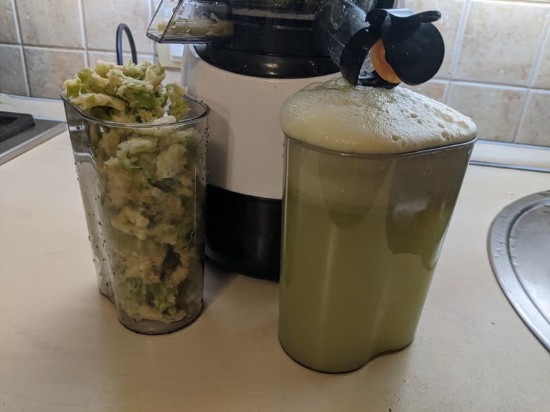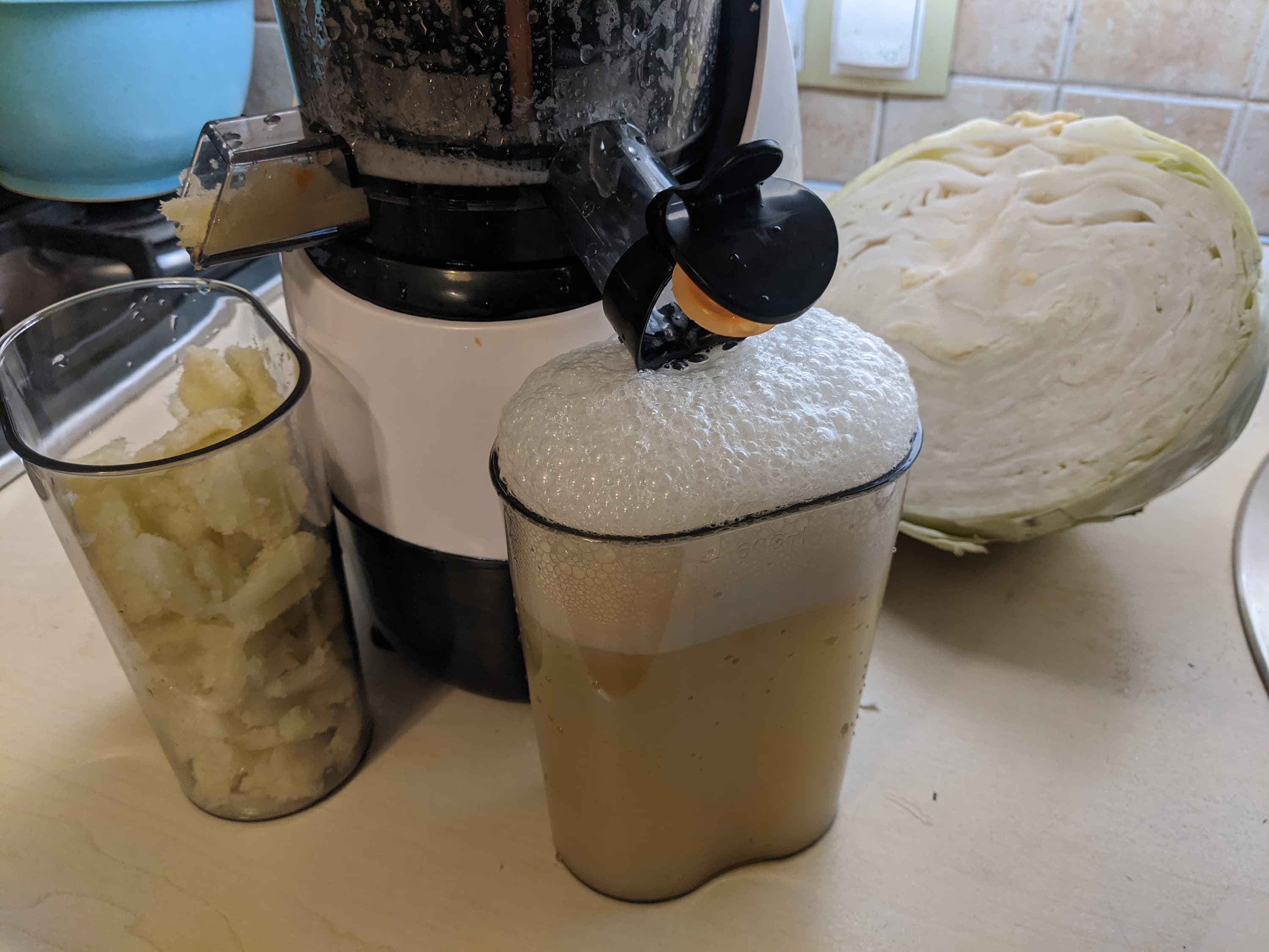 На обработку всей капусты у нас ушло 4 минуты и 24 секунды. За это время мы получили 590 г (59%) сока. Отходящий жмых имел умеренную влажность, пены образовалось довольно много.