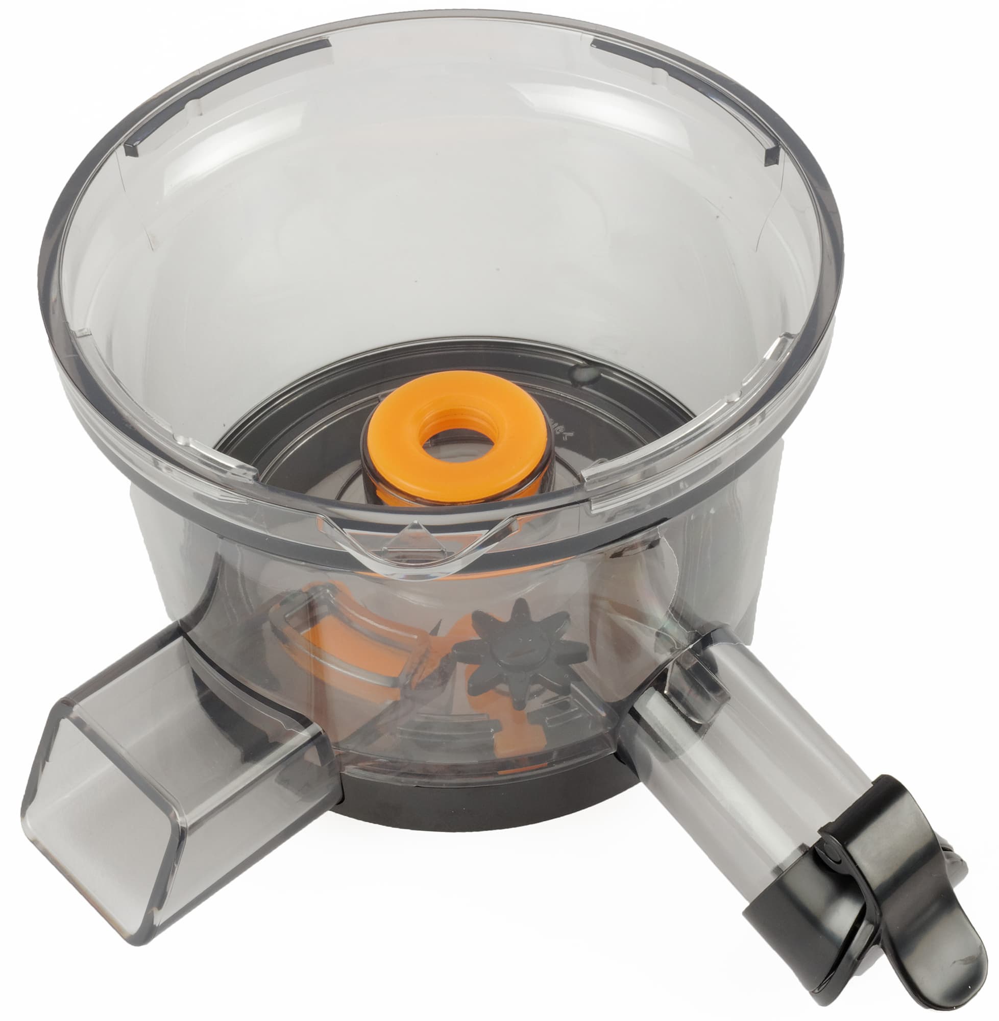 Жмых попадает на дно чаши, продавливаясь через резиновую пробку-мембрану, препятствующую проливанию сока, и удаляется через другой носик.