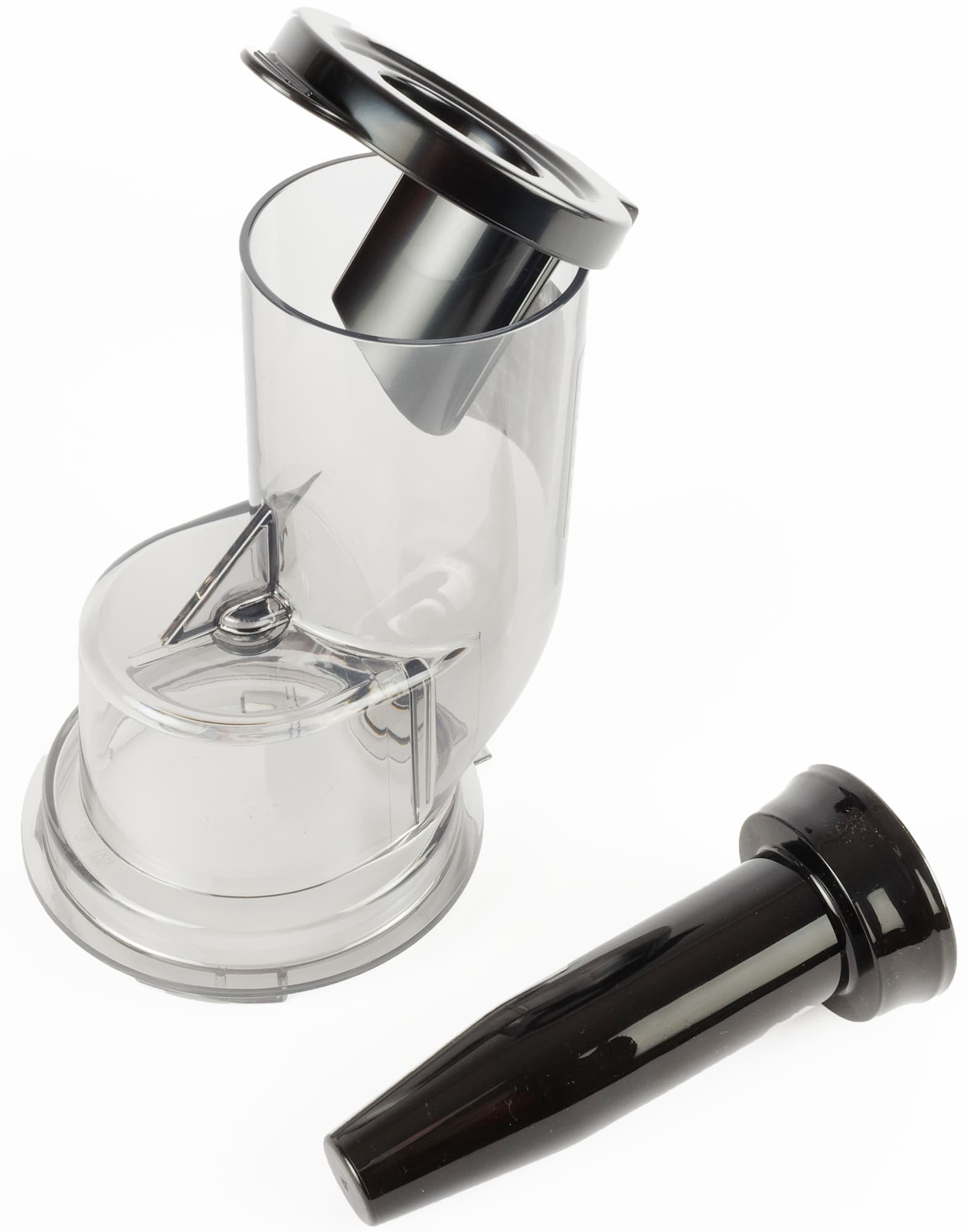 Горловина соковыжималки снабжена откидной пластиковой крышкой с отверстием, через которое можно подавать небольшие порции продуктов. Крупные плоды конструкция позволяет забрасывать в рабочую зону целиком, при этом полукруглый желоб под крышкой служит дозирующим устройством.