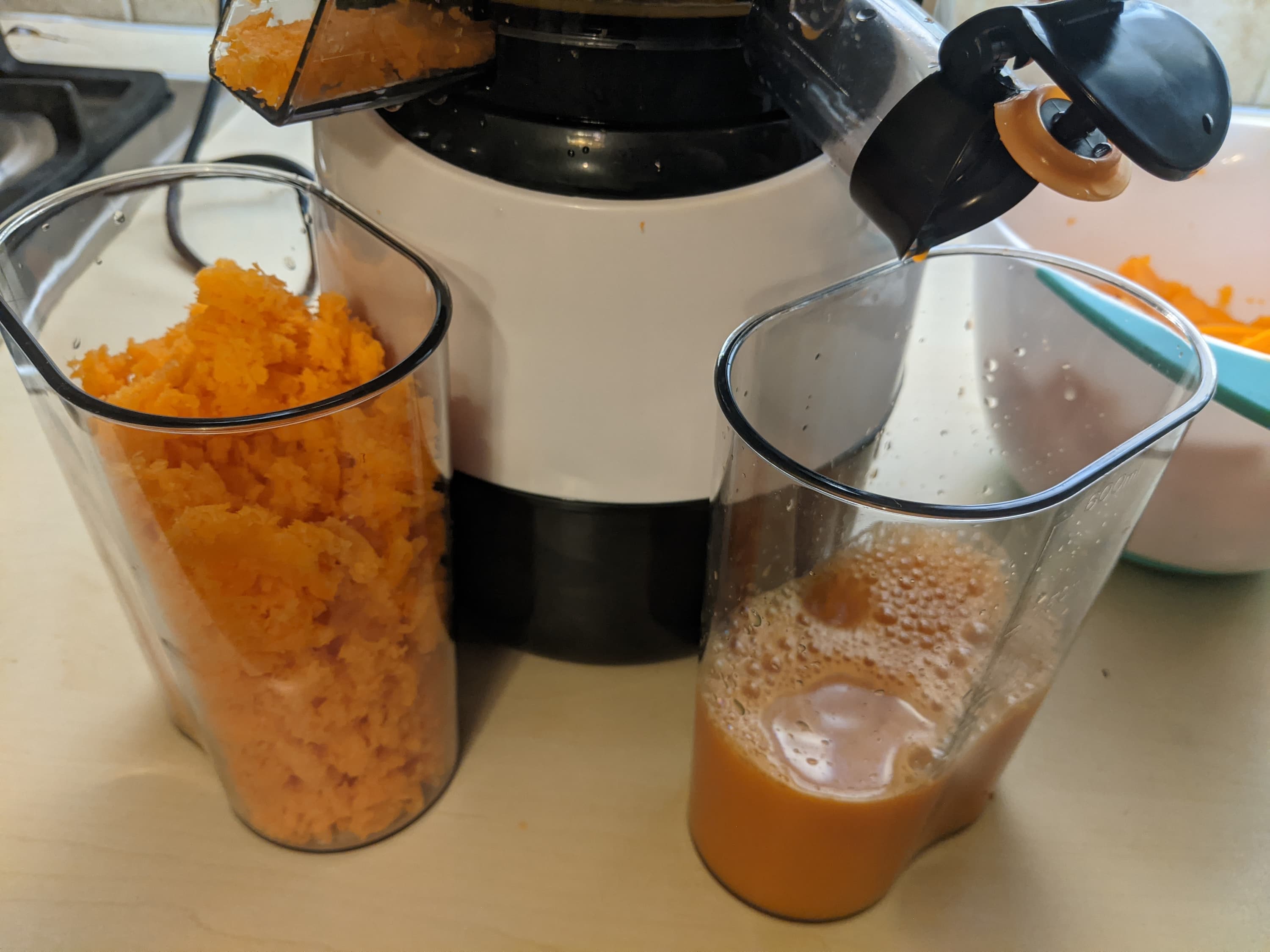 Мякоть в соке практически не ощущалась. Оставшийся после дегустации продукт был отправлен в заквашиваемую капусту для увеличения количества вкусного и полезного рассола. Из морковного и капустного жмыха получаются отличные овощные котлеты — небольшой дополнительный бонус.