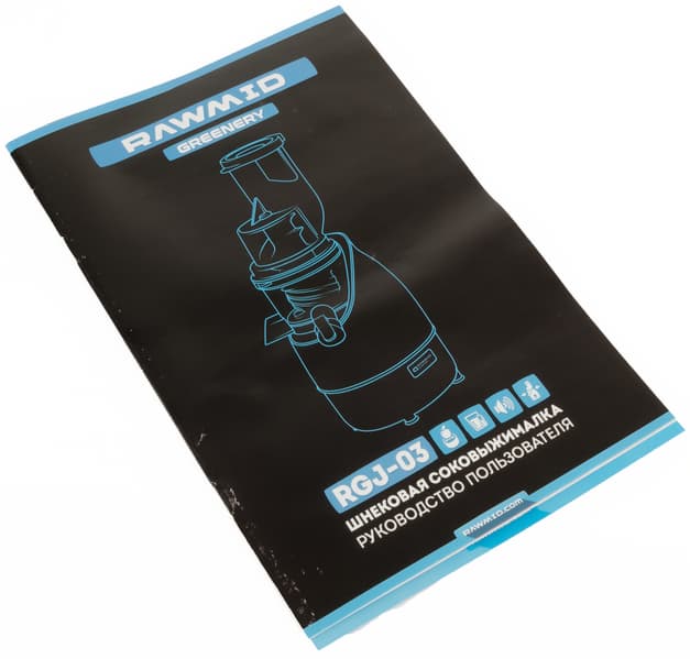 Для Rawmid свойственно прикладывать к своим приборам подробные руководства для пользователей. RGJ-03 не исключение: в брошюре формата A5 есть все нужные сведения для работы с этой моделью, иллюстрированные большим количеством цветных рисунков. Например, комплектация — это изображение всех частей соковыжималки, включая щетку для очистки и толкатель. Также сопровождаются схемами и фотографиями разделы о распаковке и сборке прибора и о его использовании.