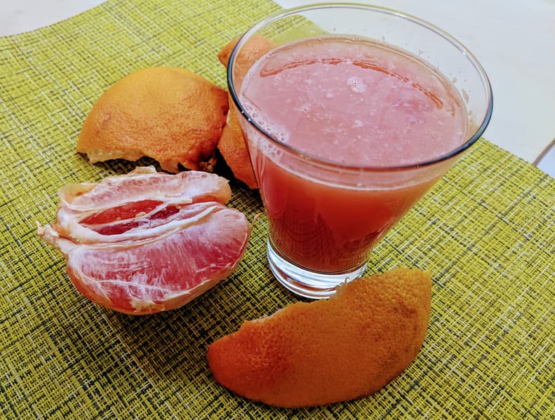 Обработка мягкого грейпфрута заняла 1 минуту и 58 секунд, выход сока составил 766 г (77%).