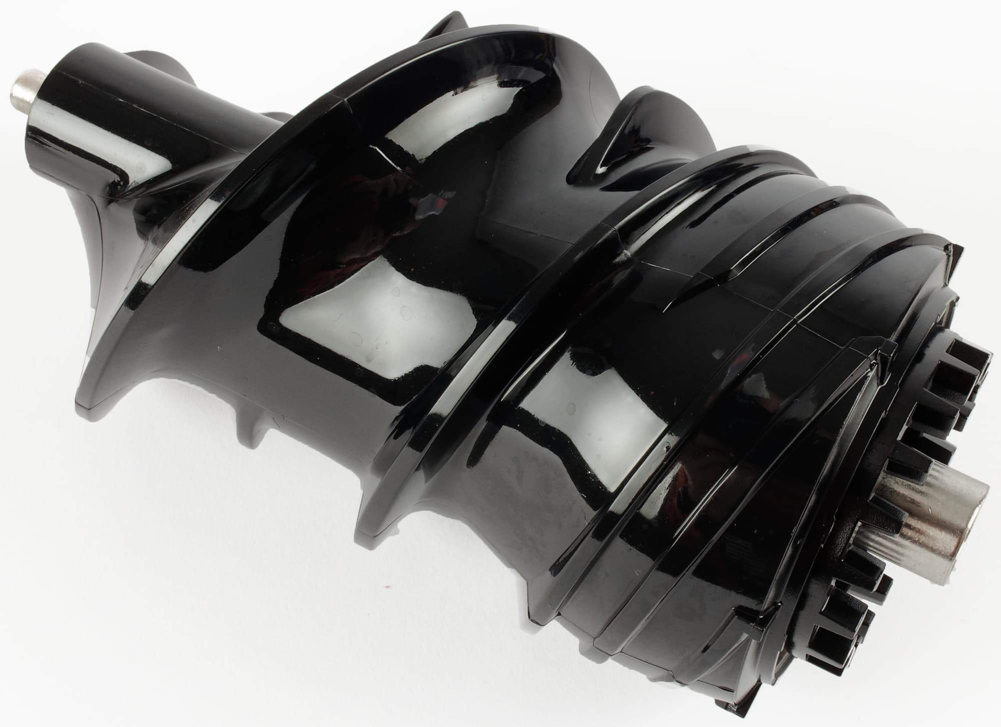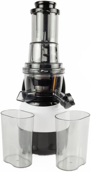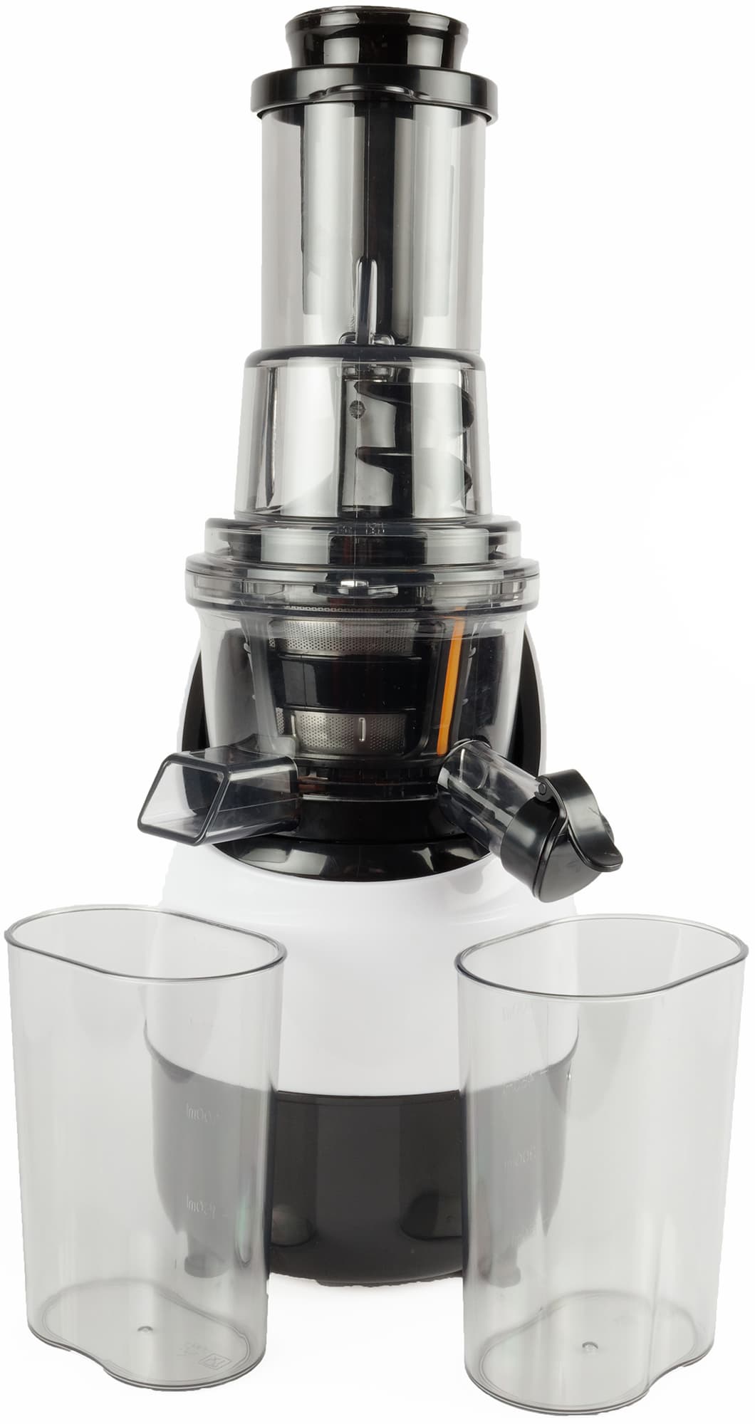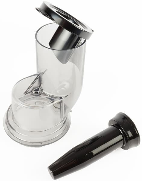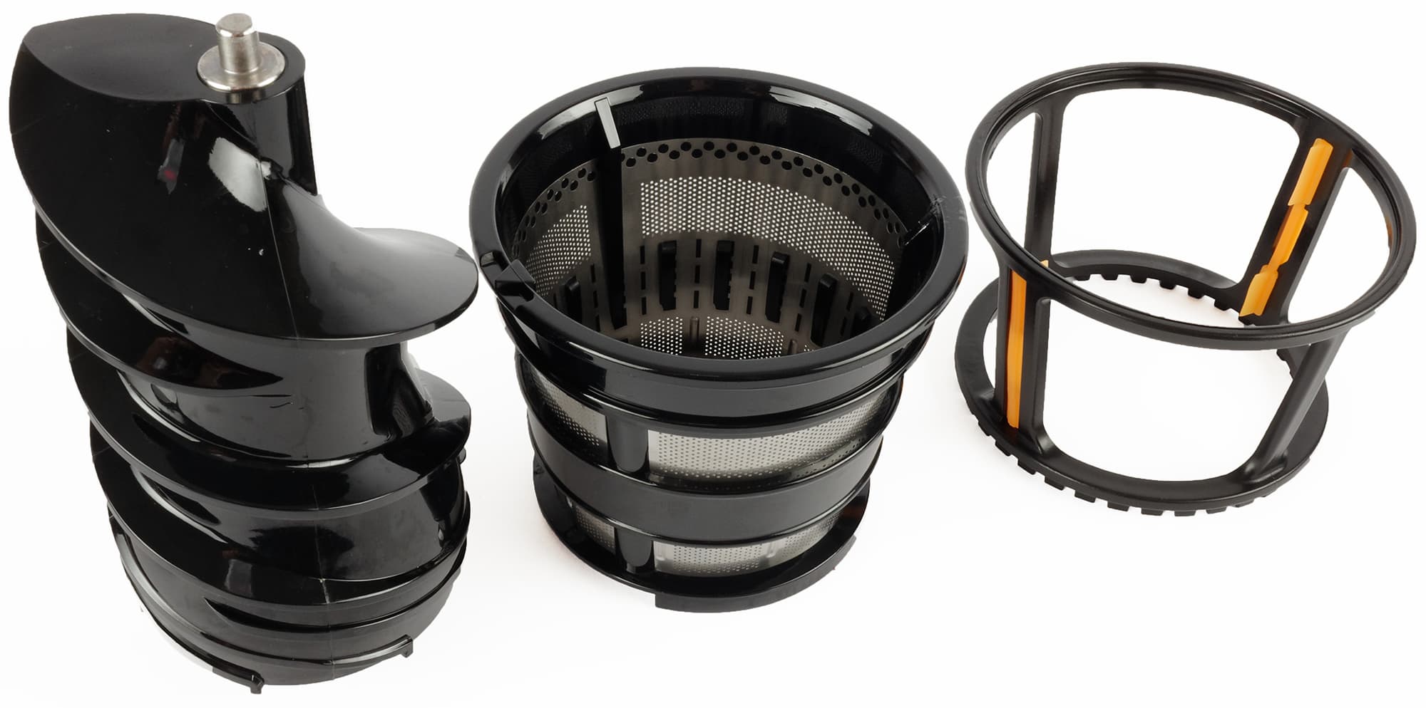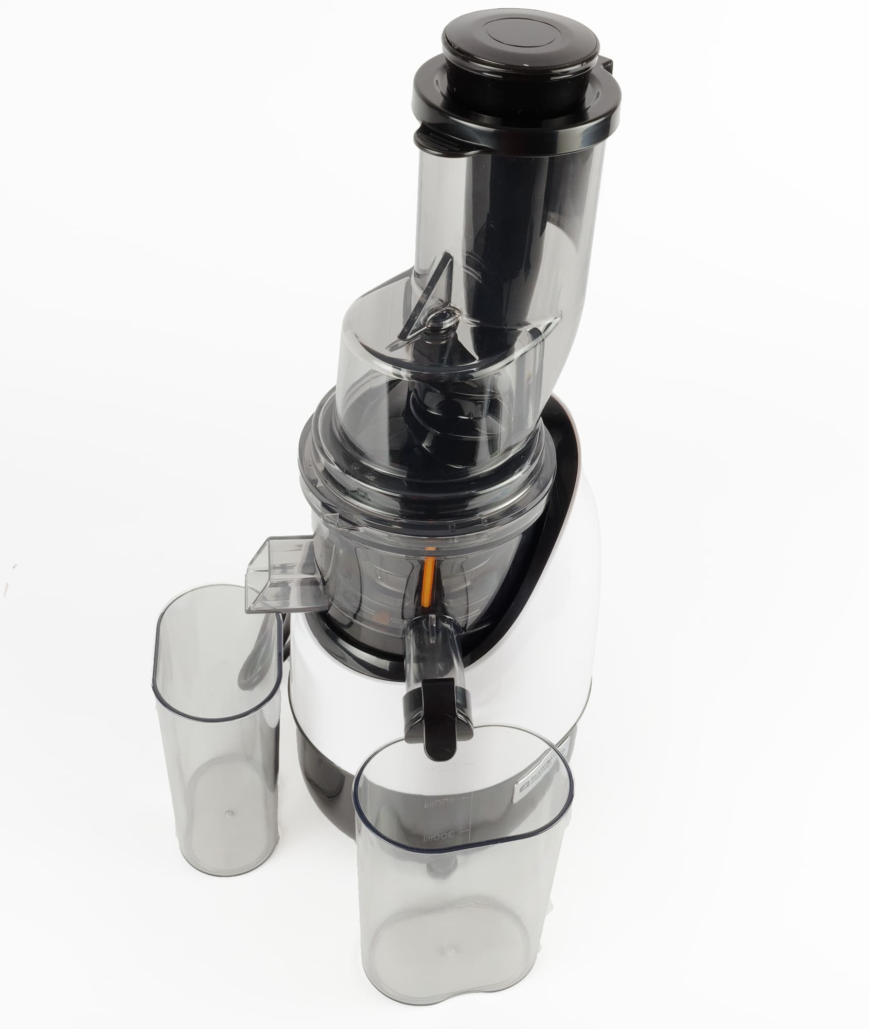 Компоновка соковыжималки традиционна. Продукты подаются в горловину устройства и попадают на медленно вращающийся шнек, который дробит их и продавливает через стальную решетку фильтра.