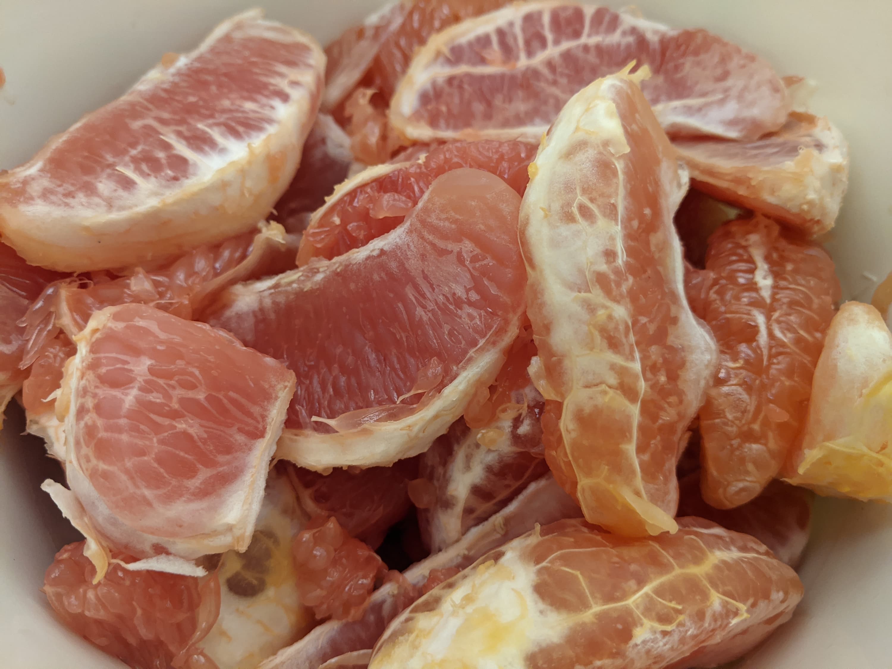 Плоды грейпфрута мы очистили от шкуры и пленок, разделили на дольки и подготовили ровно килограмм сырья.