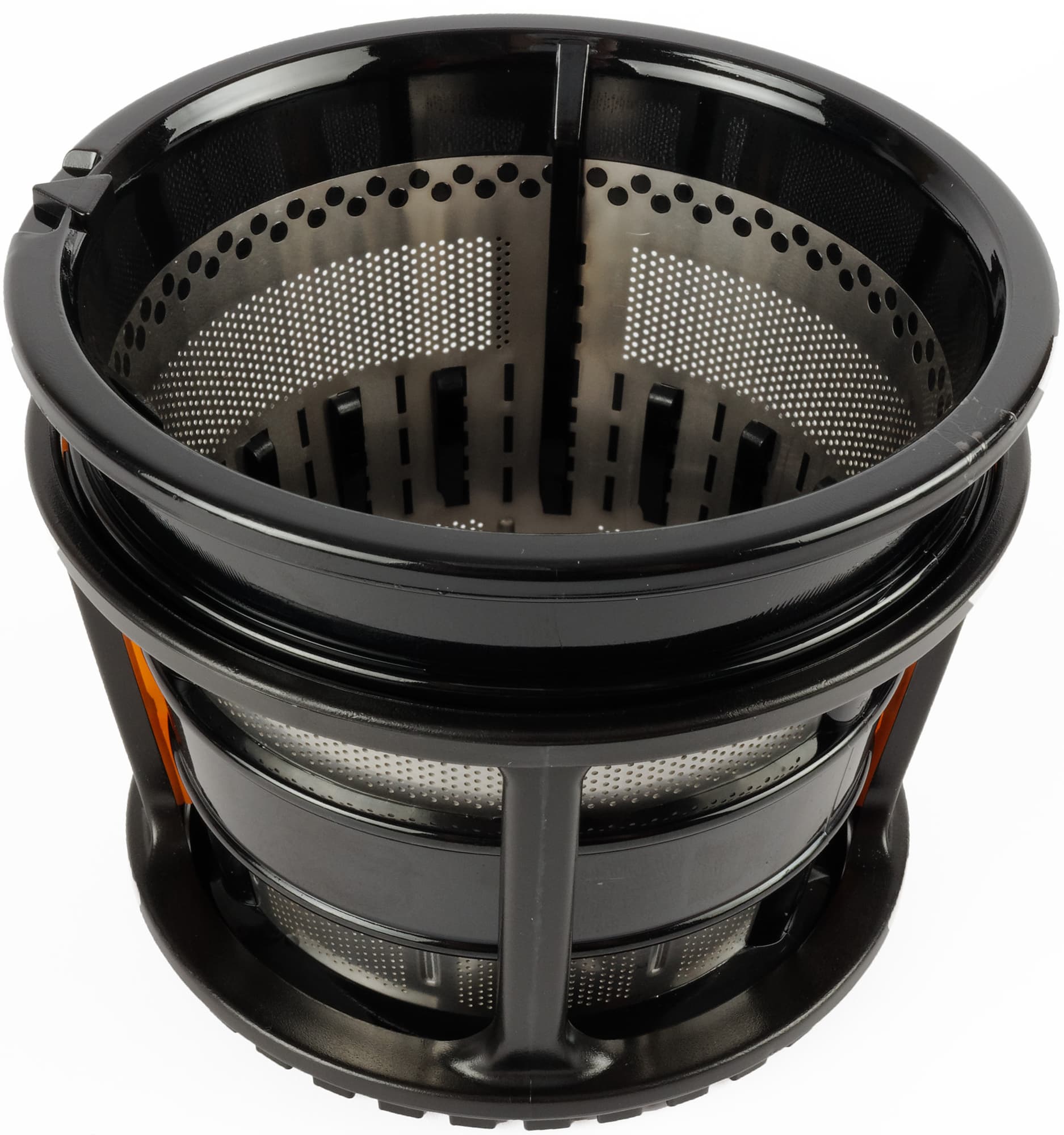 Между фильтром и корпусом в противоположную вращению шнека сторону крутится держатель фильтра, снимающий с наружных стенок решетки мякоть фруктов и овощей.