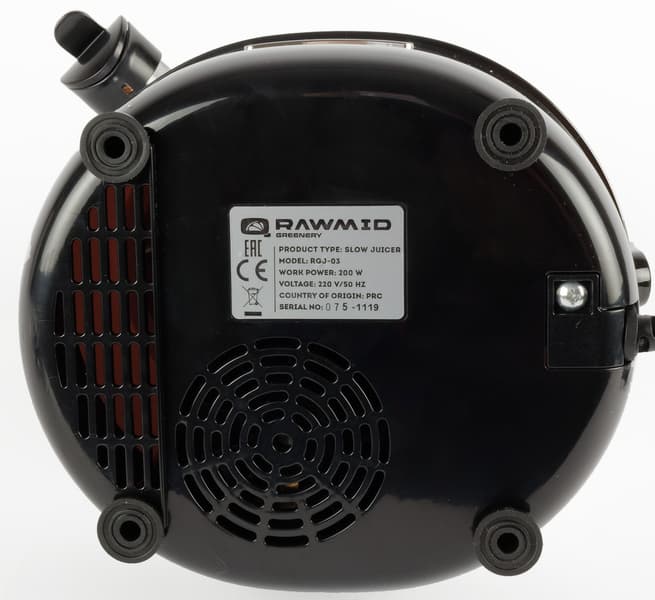 Моторный блок выполнен из гладкого пластика и оформлен в строгой черно-белой гамме, одинаково уместной на кухне любого стиля. Вентиляция электродвигателя осуществляется снизу, через решетки в основании.