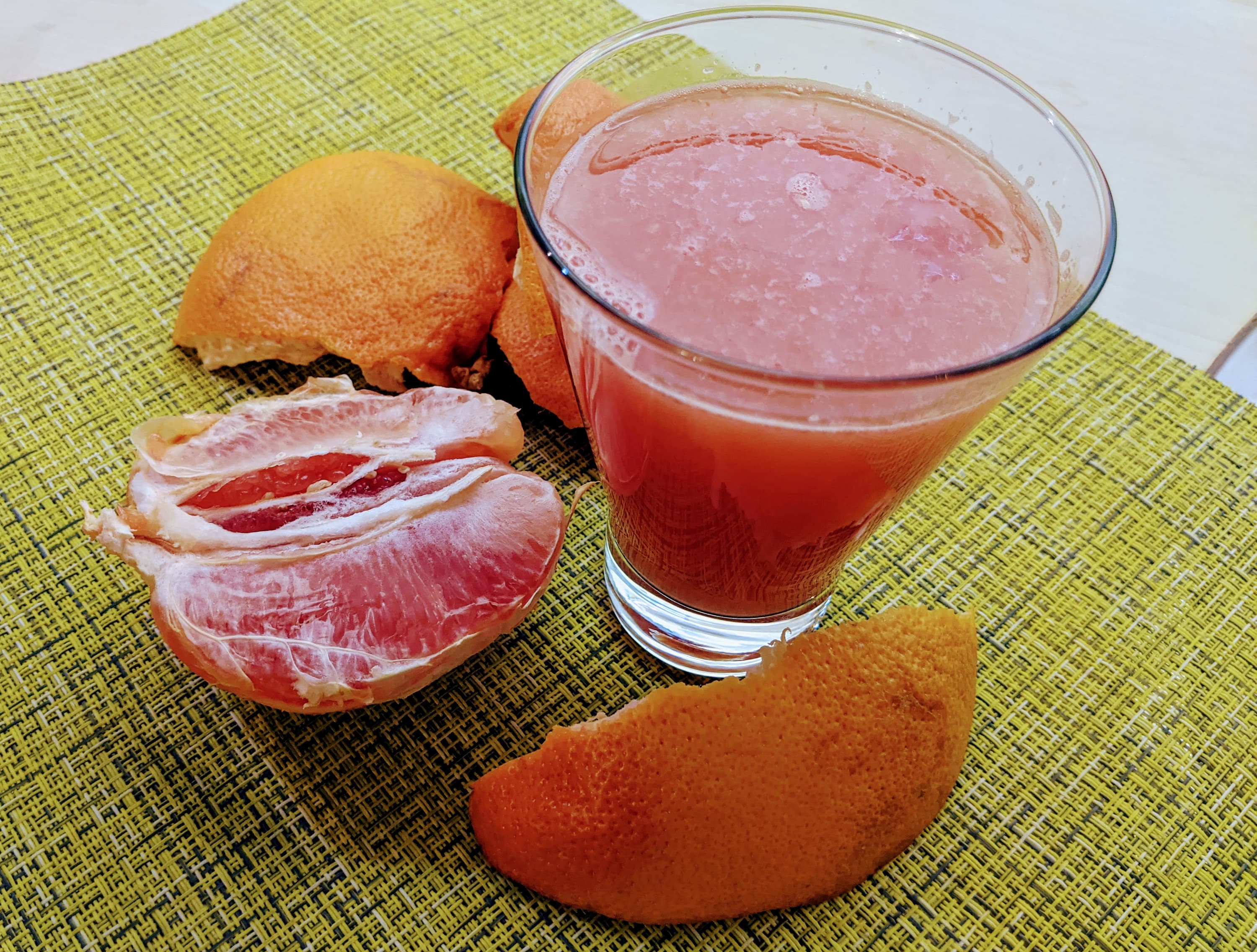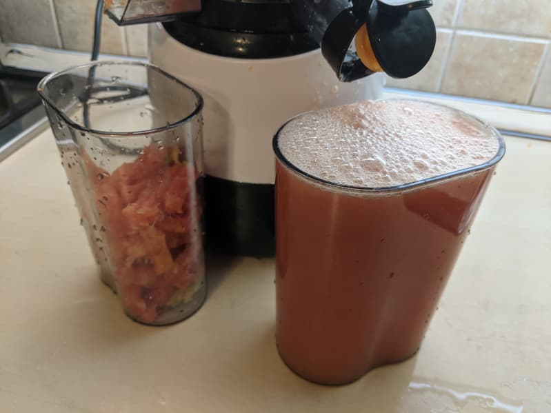 Отходы оказались довольно влажным, но сок в отверстие для жмыха не переливался. Образование пены при отжиме незначительное. Сок получился вкусным и красивым. При отжиме можно регулировать горечь: если оставить побольше пленок, то его можно использовать в качестве тоника в коктейлях.