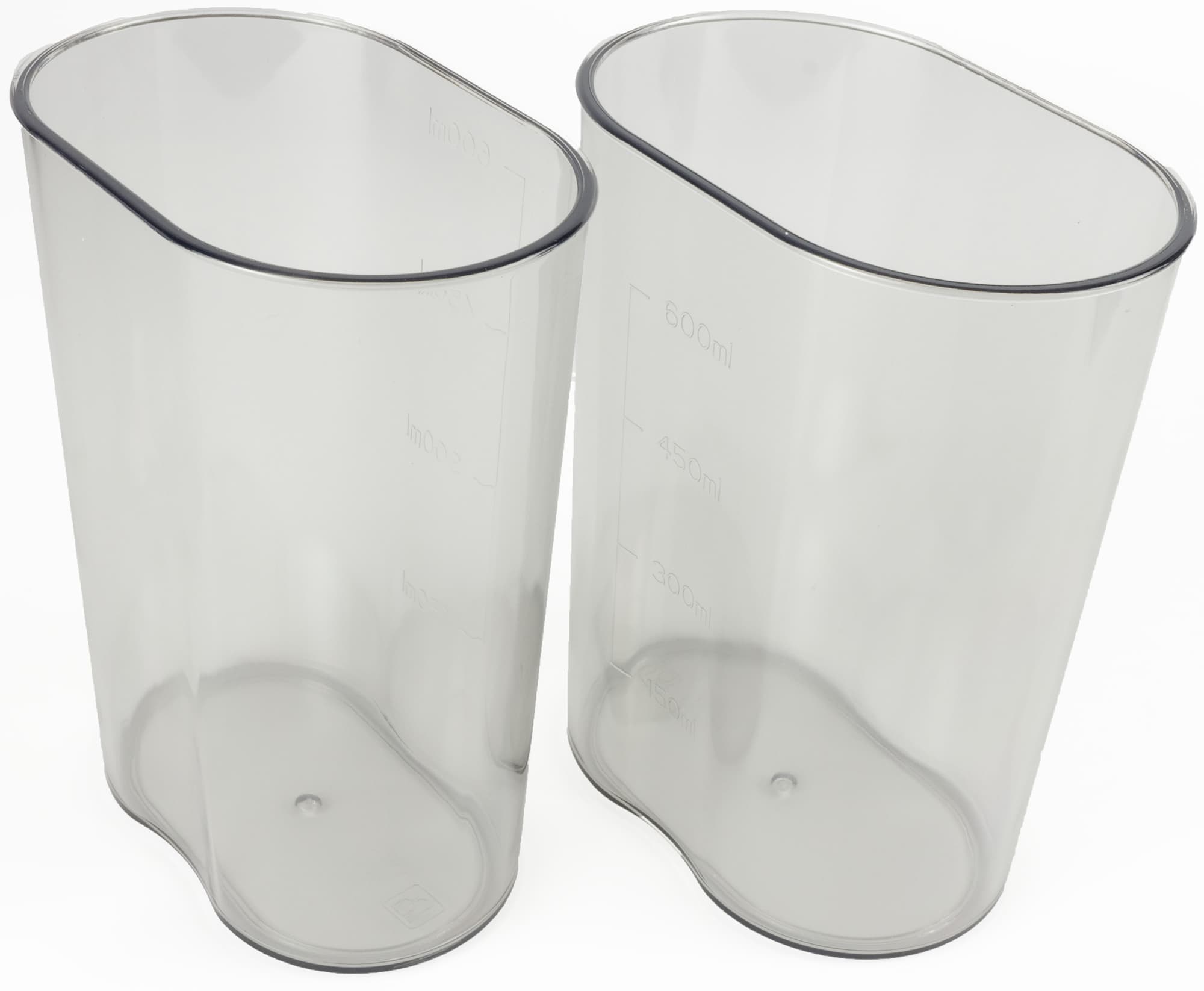 Два стакана из сероватого прозрачного пластика — для сока и для жмыха — имеют продолговатую форму, а размеры у них рассчитаны на то, чтобы вкладывать их друг в друга при хранении.