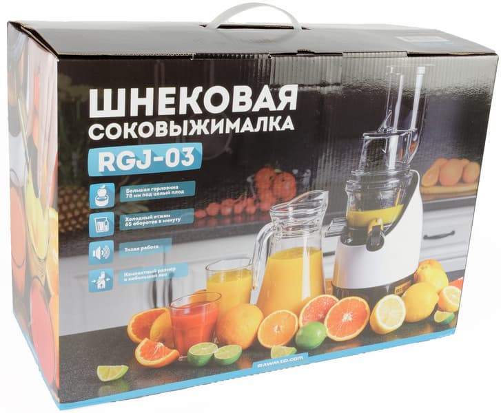 Помимо названия модели, на лицевую сторону коробки вынесены главные, с точки зрения производителя, ее особенности: большая горловина диаметром 78 мм («под целый плод», уточняет картинка), холодный отжим (65 оборотов в минуту), тихая работа, компактный режим и небольшой вес.