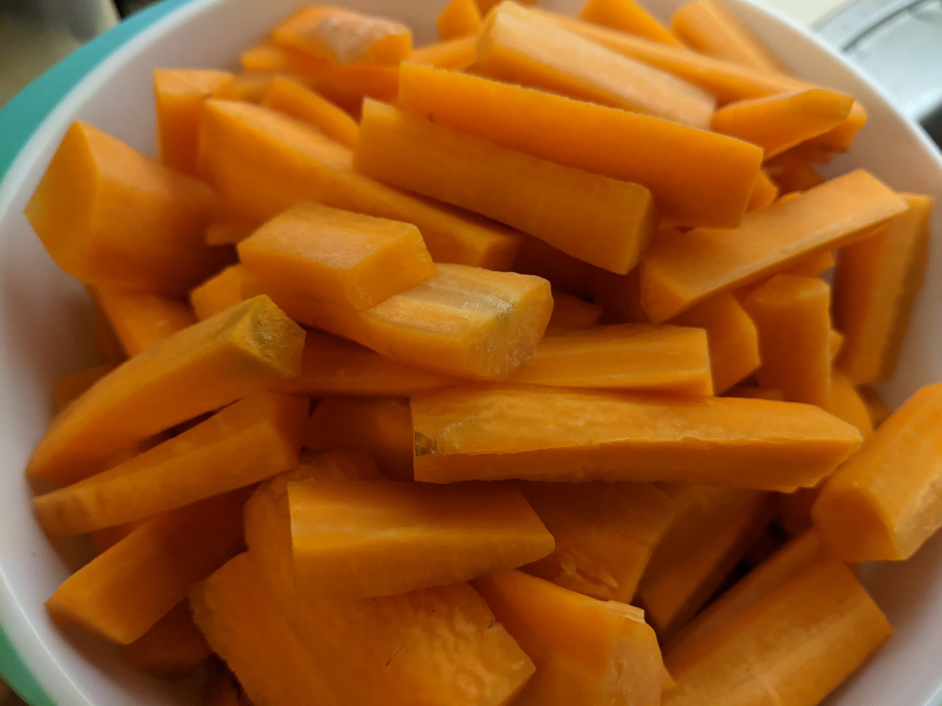 Очищенную морковь мы разрезали на дольки длиной 3-5 см и толщиной приблизительно в 1 см. Снова отмерили ровно килограмм.
