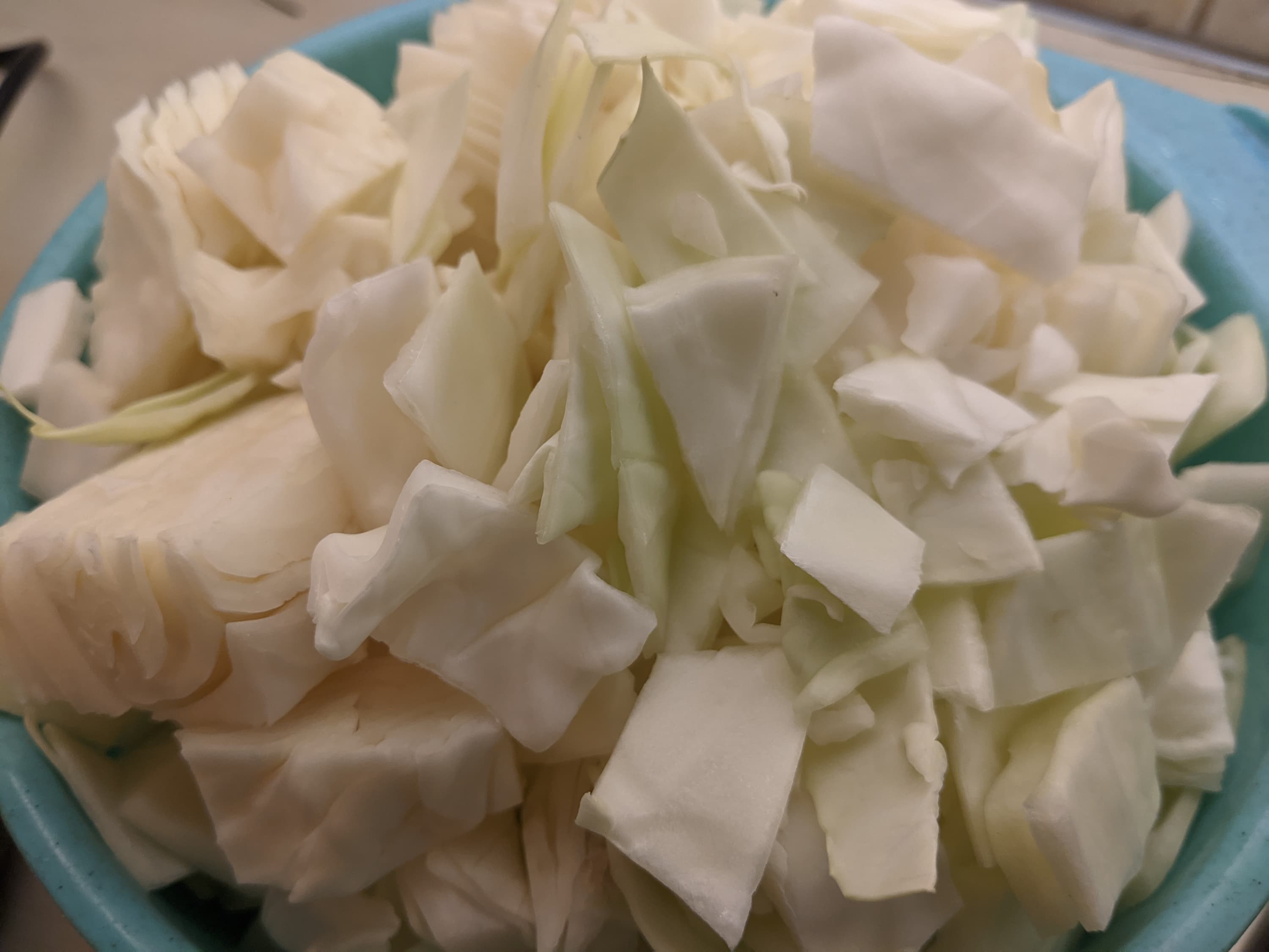 Капусту мы нарезали на квадратные кусочки со стороной 1-3 см и снова отмерили килограмм сырья.