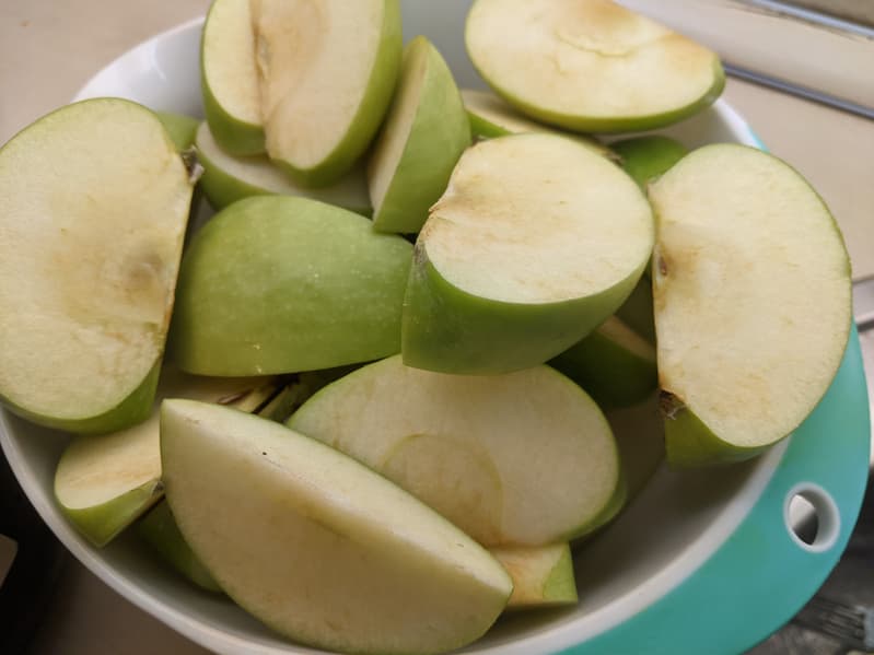 Яблоки мы порезали на 6-8 частей, не удаляя сердцевину и шкурки, и отмерили ровно килограмм сырья.