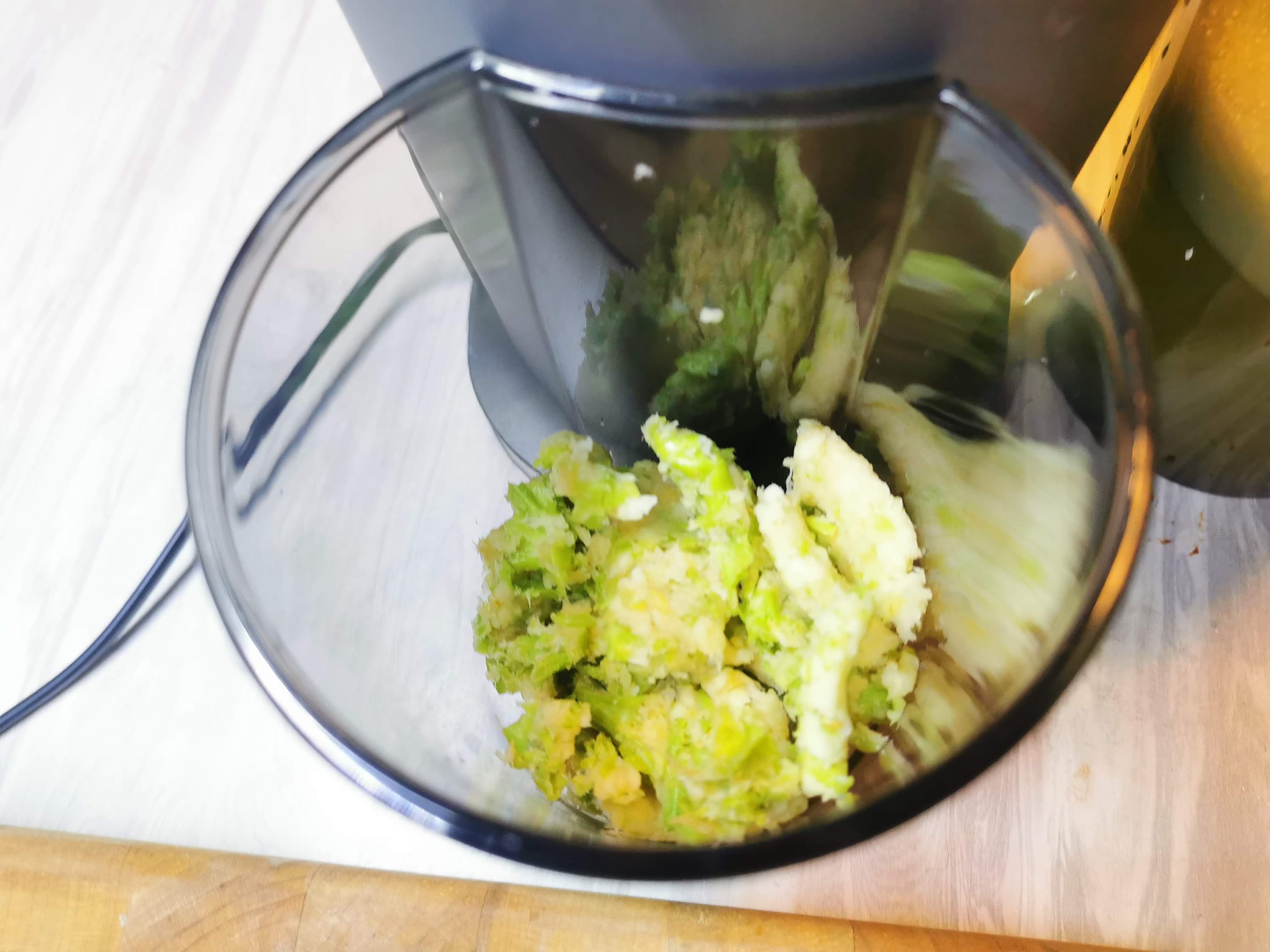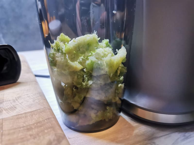 Капуста легко измельчалась, иногда поскрипывая при застревании и прилипании к стенкам чаши, но в этом случае на помощь приходила функция реверса. Отжим происходил не очень быстро, особенно потому, что мелкие кусочки приходилось загружать по очереди и дольше обычного, но мы получили отличный по качеству сладковатый капустный сок с большим количеством воздушной пены.