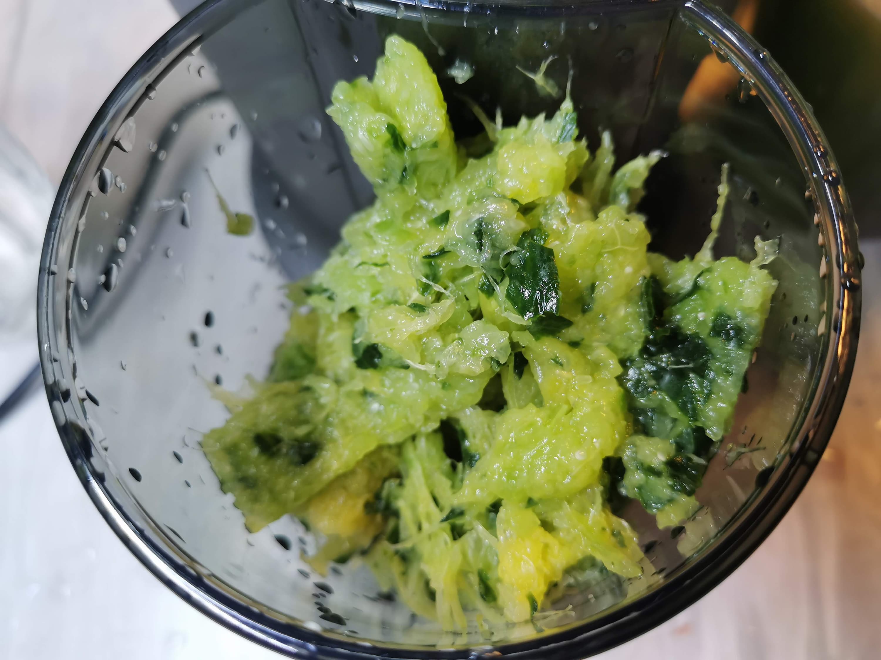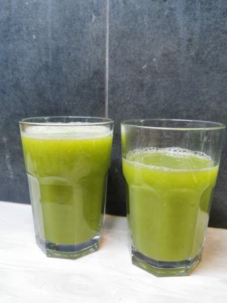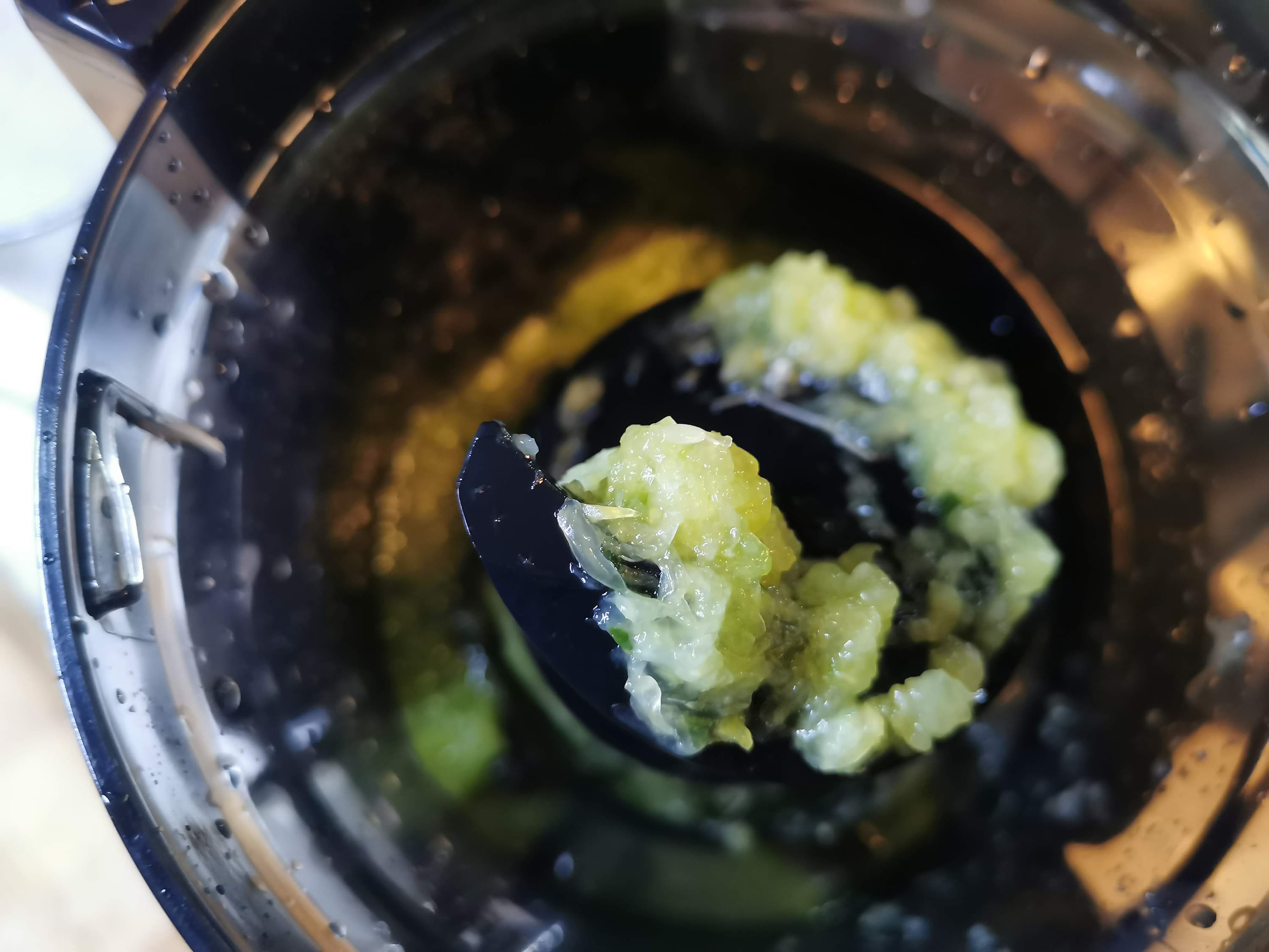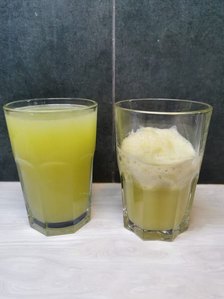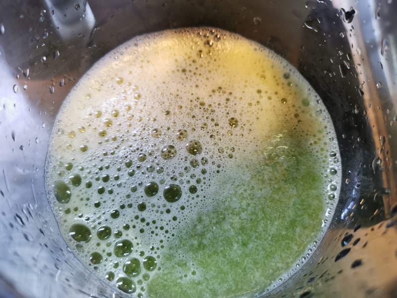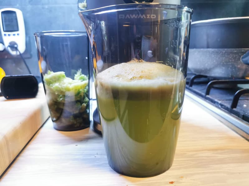 В процессе отжима мы быстро получили отличный результат — ароматный зеленый сок с большим количеством густой, постепенно оседающей пены.