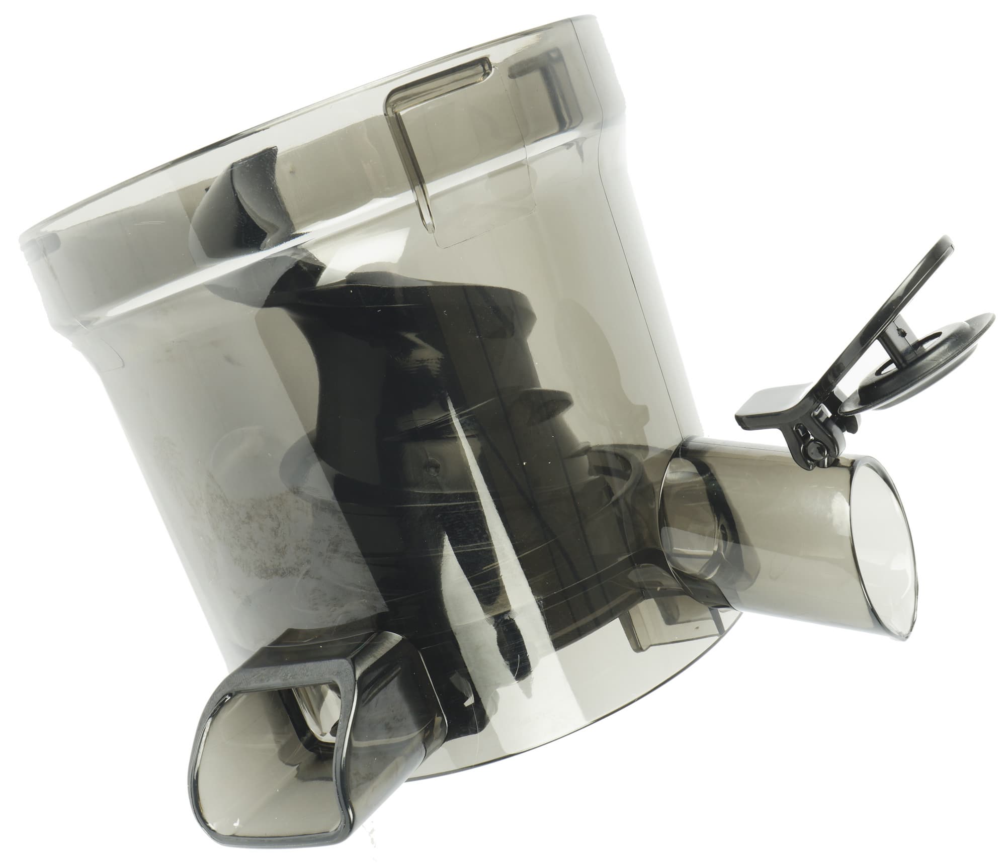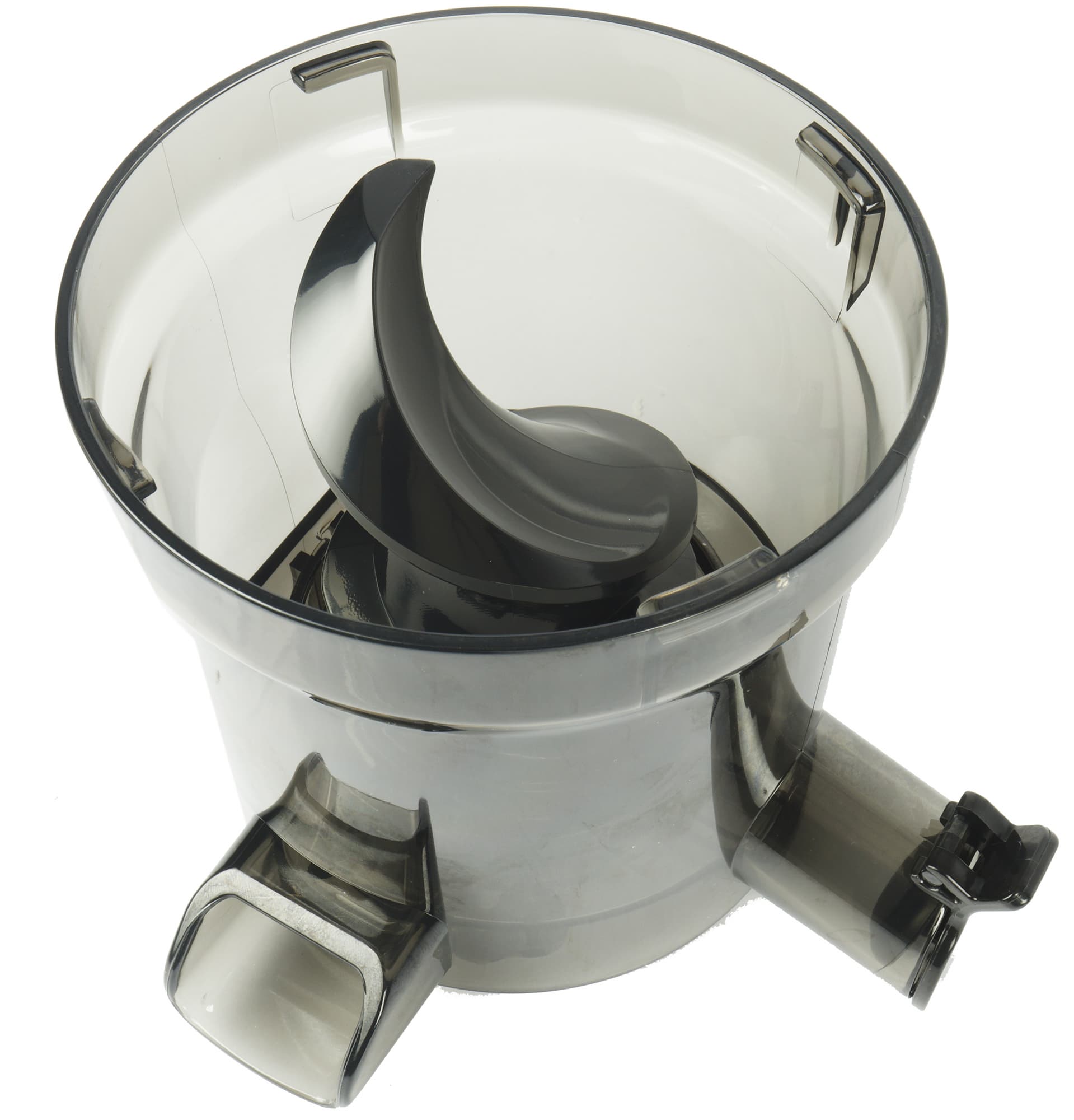 Чаша сделана из прозрачного пластика и имеет два носика: один — для выхода сока, другой — для жмыха.