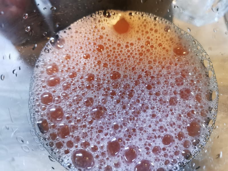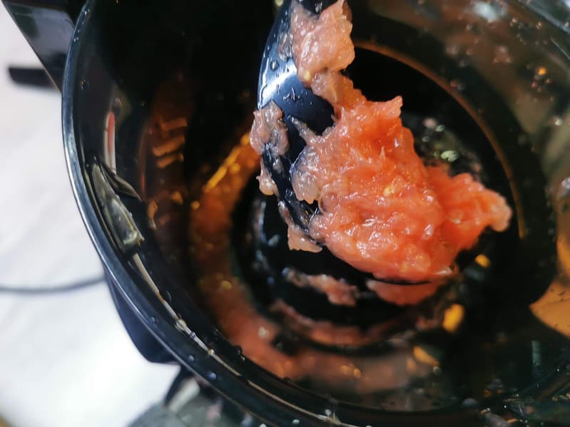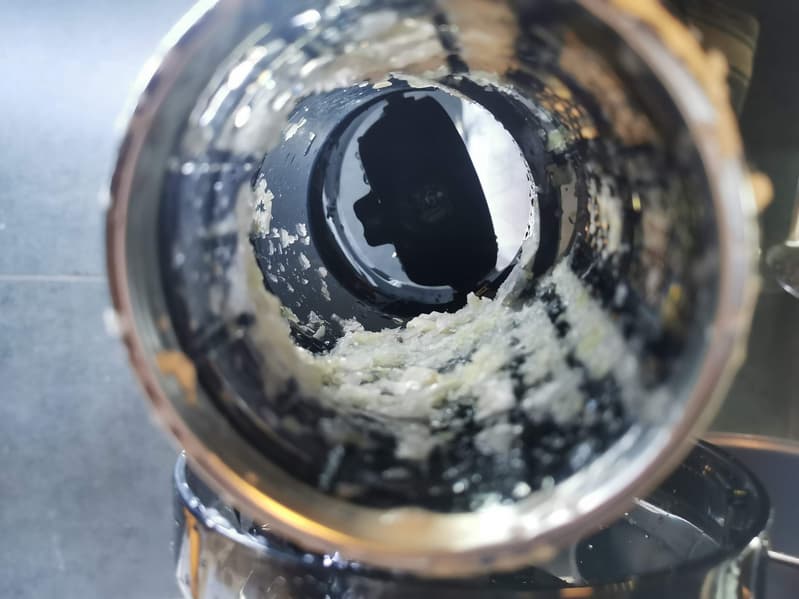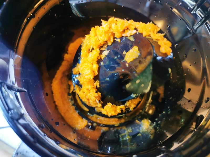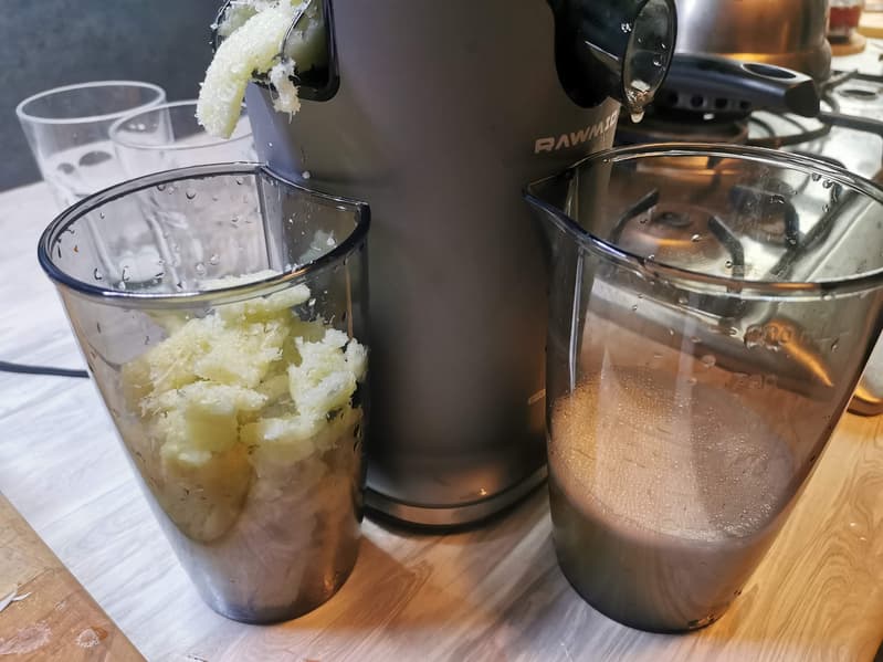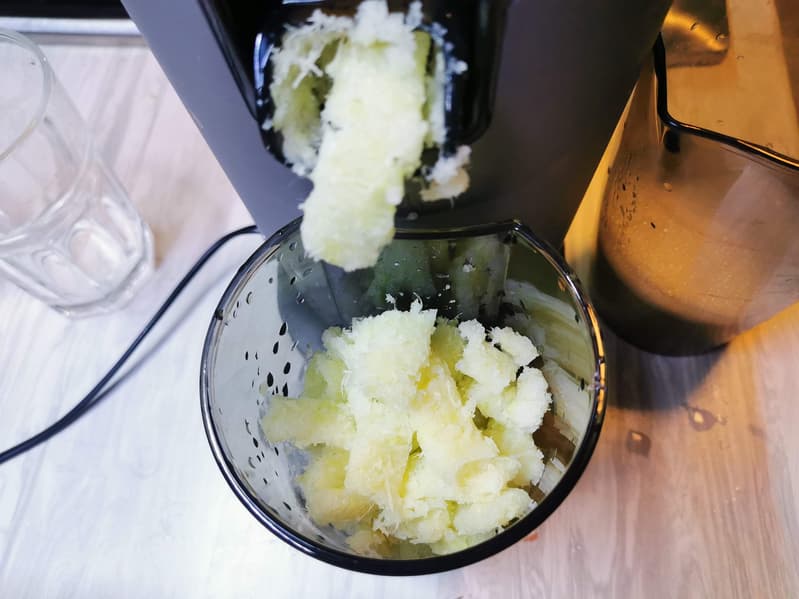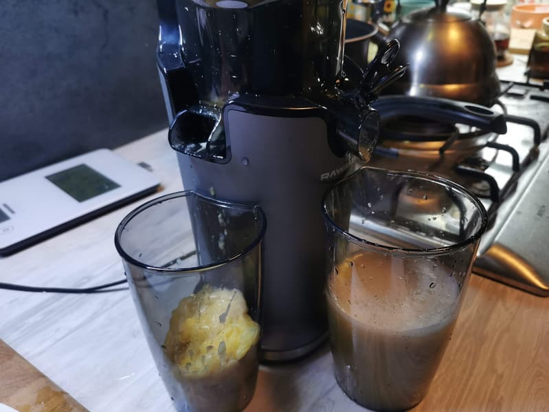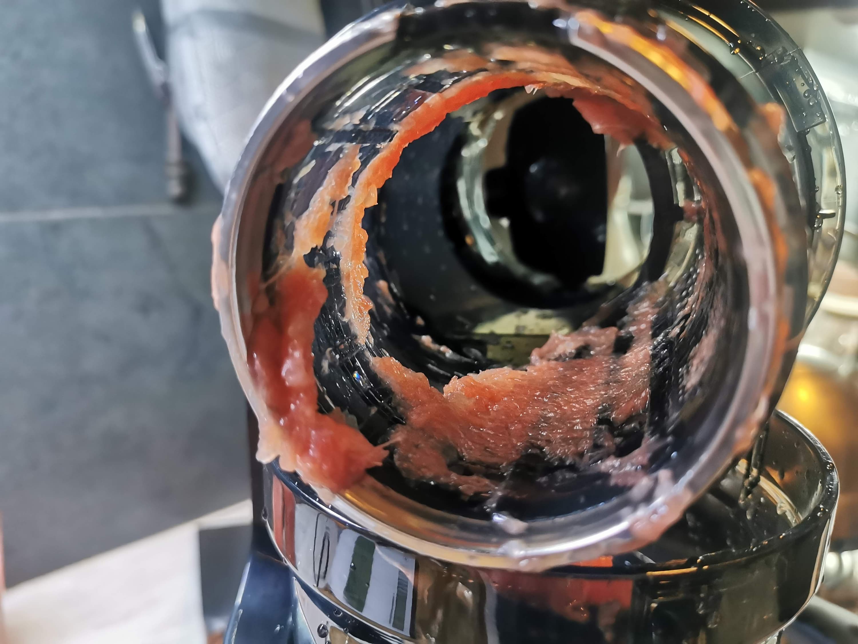 Но, конечно, по итогу нам не удалось избежать кашеобразной сочной массы в чаше, так что на этом этапе мы потеряли значительное количество сока.