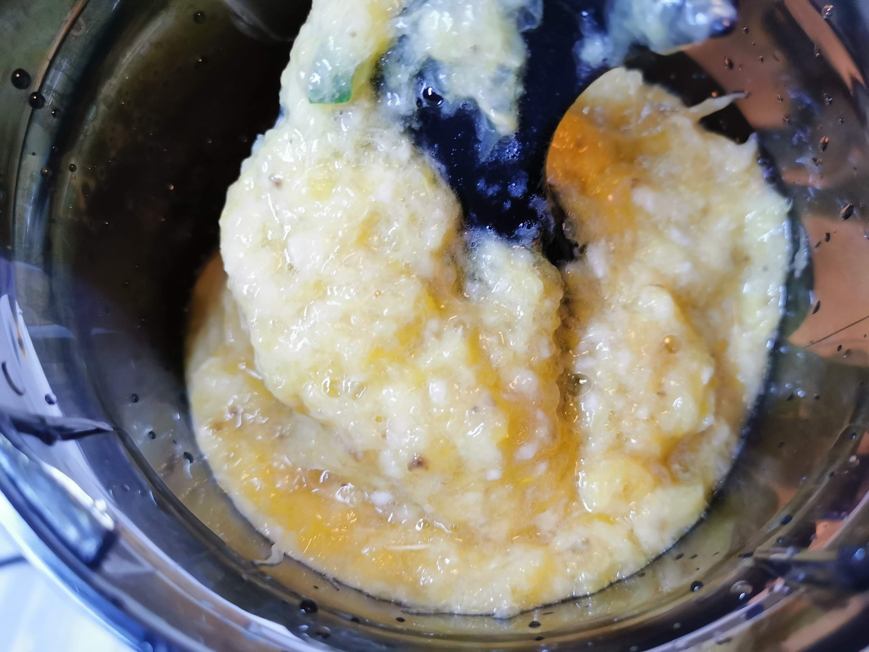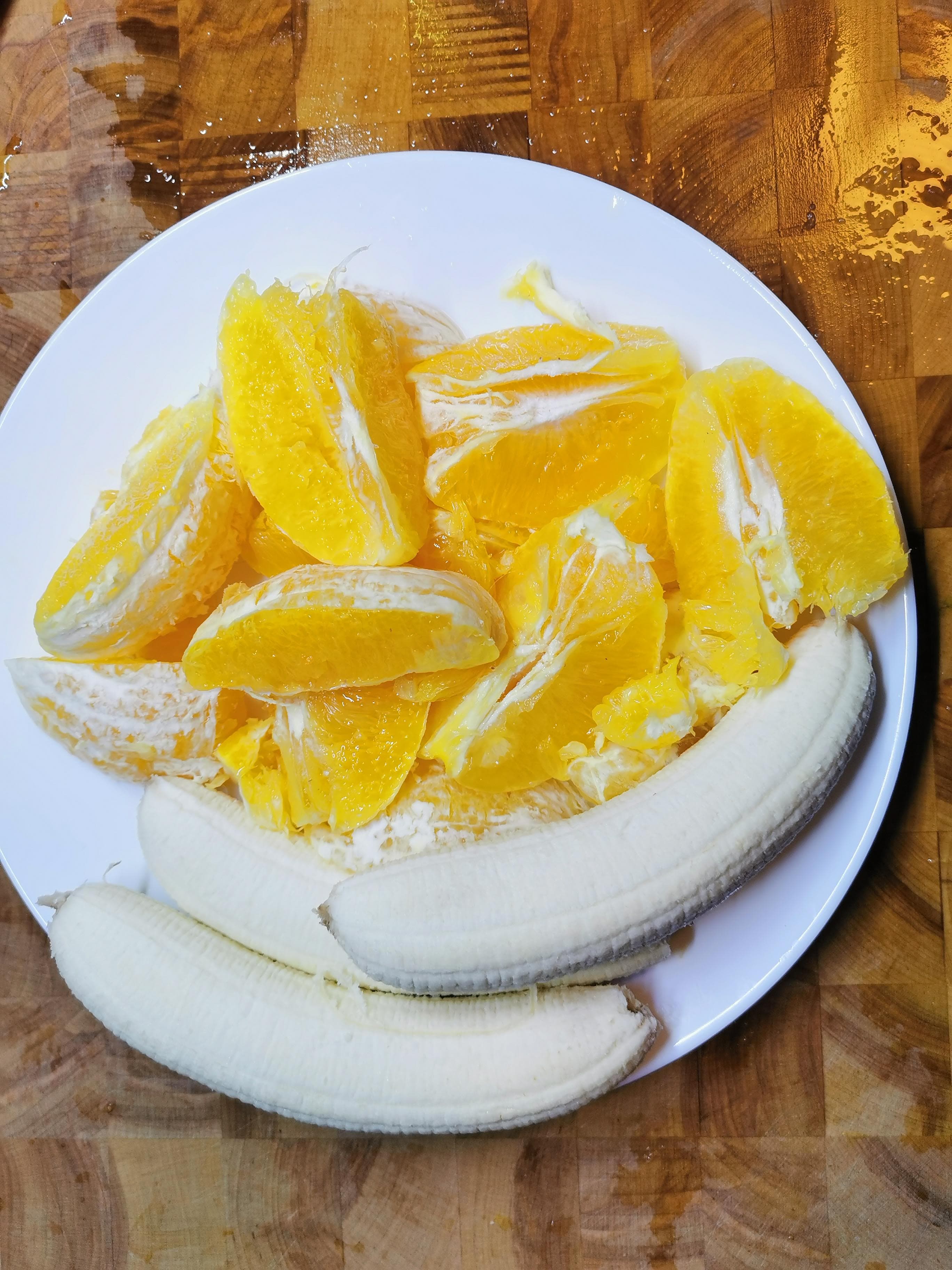 Для этого мы взяли 3 крупных апельсина, почистили их и разобрали на дольки, а также почистили 4 маленьких зеленых банана весом около 100 г каждый (на фото 3 банана, четвертый мы добавили уже в процессе). Итого вес очищенных продуктов составил 963 грамма.