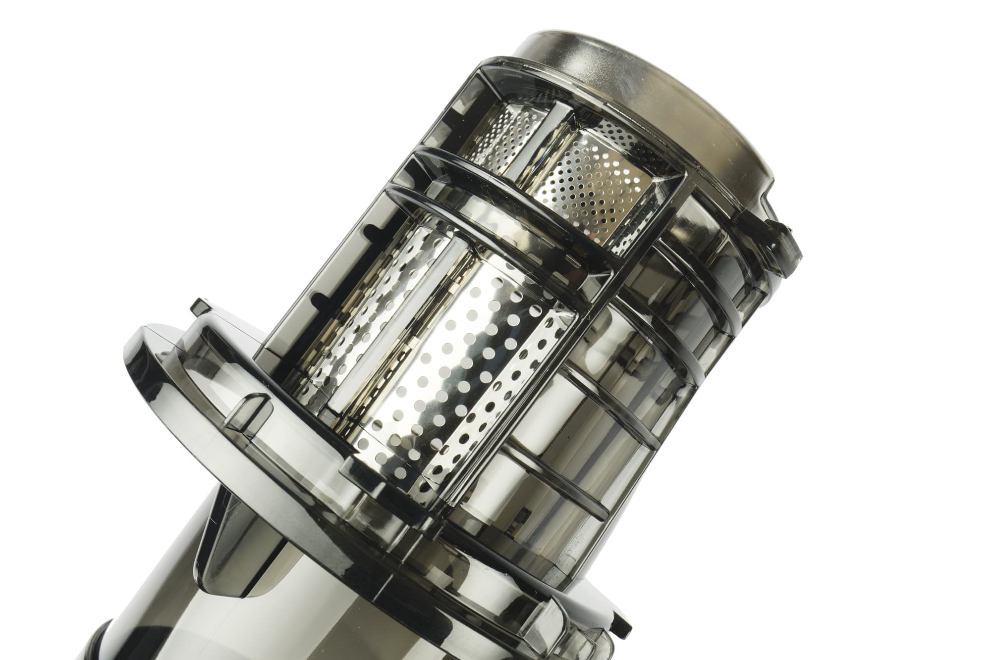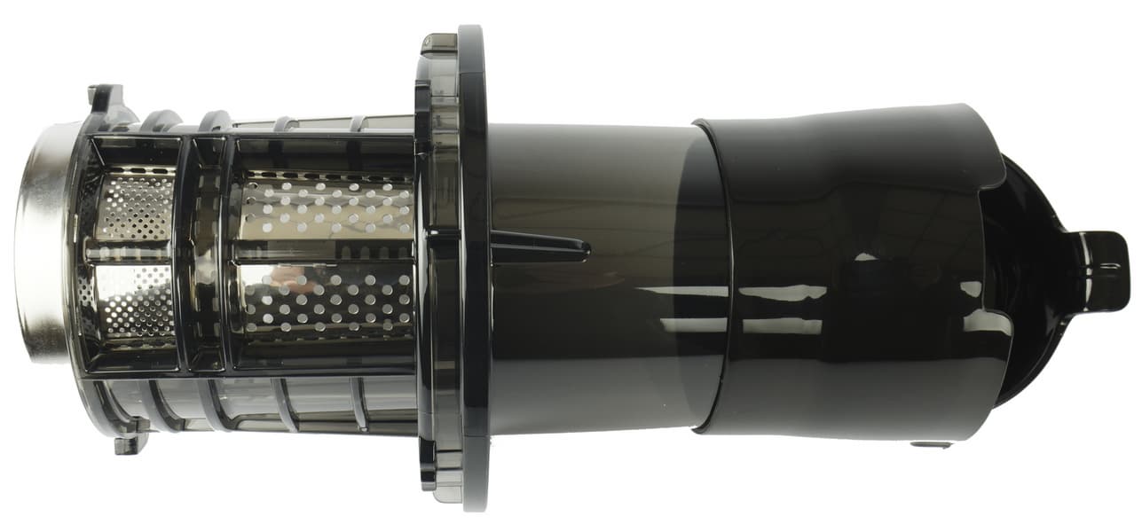 Терка на первый взгляд выглядит классическим образом для шнековой соковыжималки — круглая сетчатая воронка, внутрь которой вставляется шнек. Присмотревшись, мы обнаружили, что конструкция отличается от стандартной: в нашем случае сито является спаренным с горловиной.