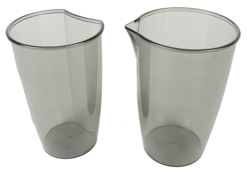 Стаканы для сока и для жмыха сделаны из прозрачного матового пластика и имеют градуировку с рисками в 300, 400, 500, 600, 700 и 800 мл. Они никак не прикрепляются к корпусу и их можно свободно переставлять. Стакан для жмыха также имеет с оной стороны удобное углубление внутрь по все длине, благодаря которому стакан плотно прилегает к моторному блоку.