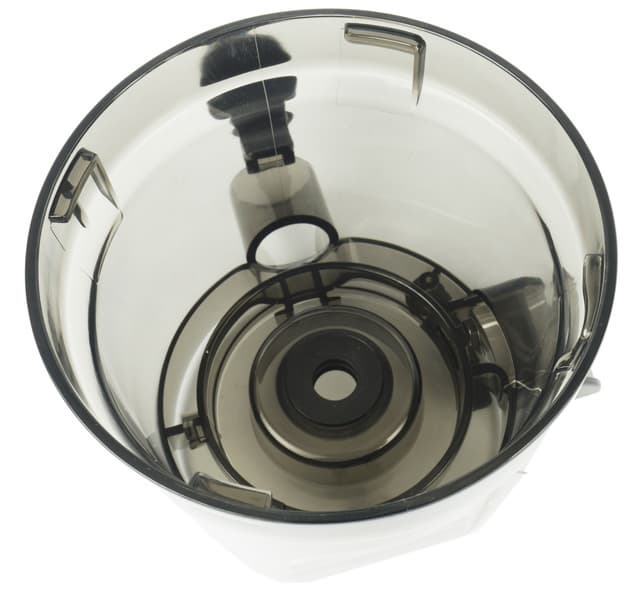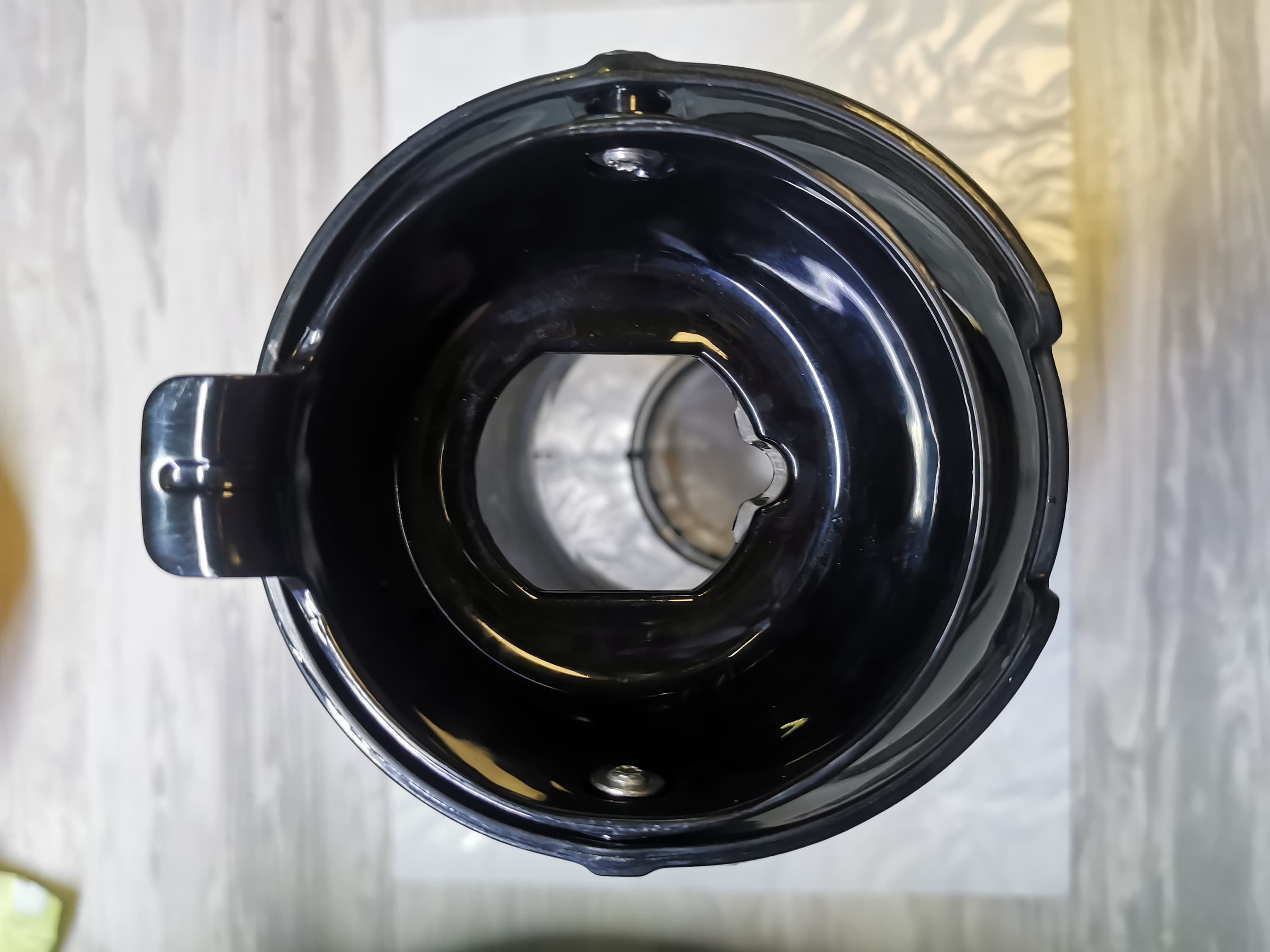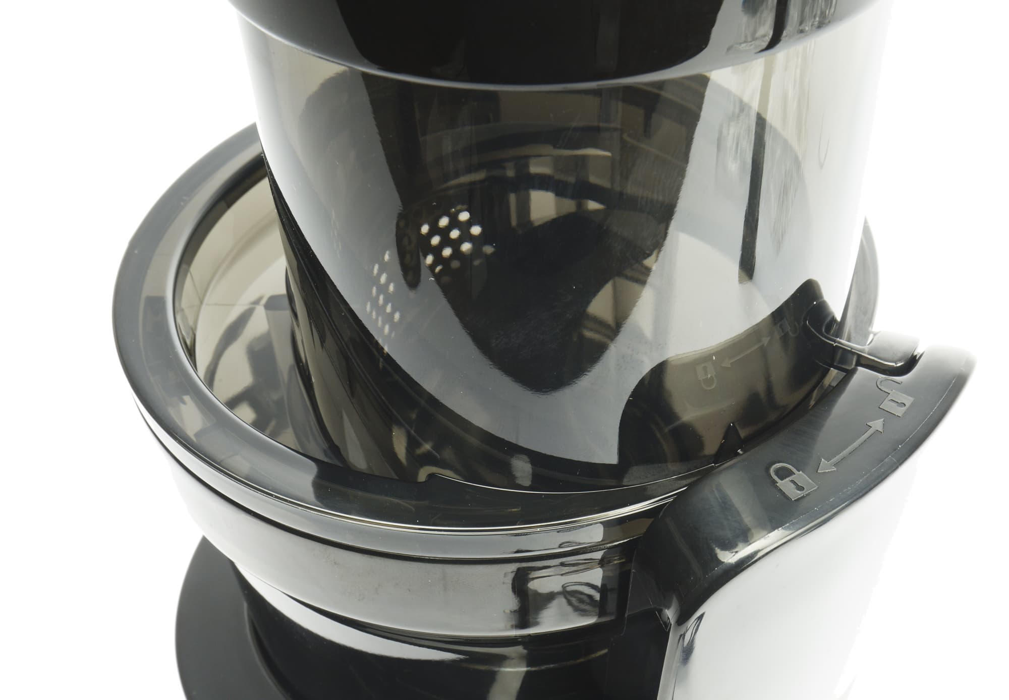 На чаше соковыжималки имеется пластиковая черная ручка, которая вмещает внутри себя механизм соединения частей соковыжималки. Вся система защелкивается только в том случае, когда чаша корректно установлена на моторный блок, а сверху верно закреплена крышкой с загрузочной горловиной. Прибор не начнет работу при неправильной сборке.
