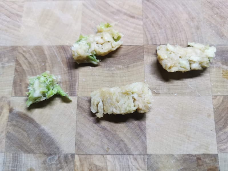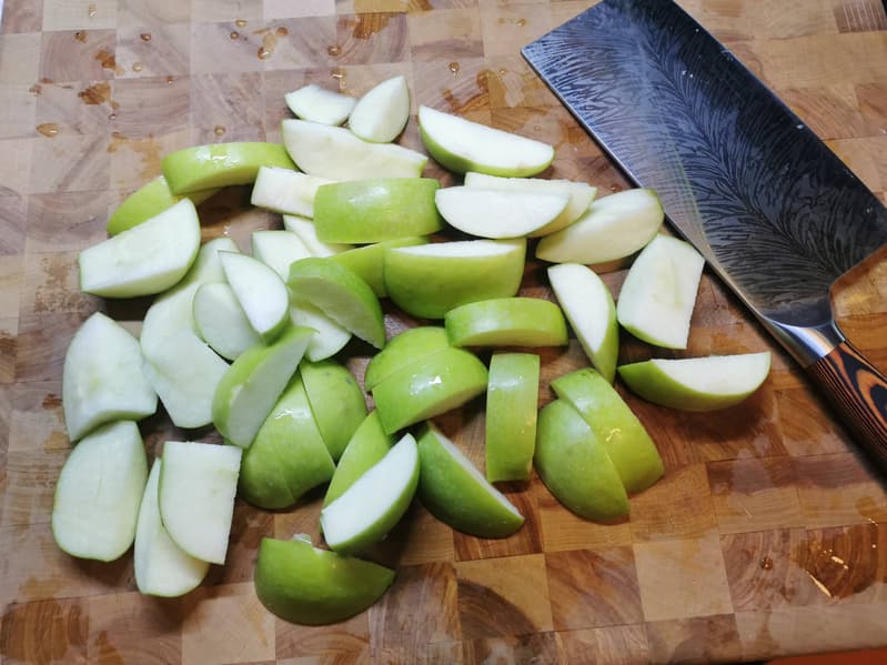 Мы нарезали яблоки сорта «Гренни Смит» на мелкие кусочки, убрав из них сердцевину.