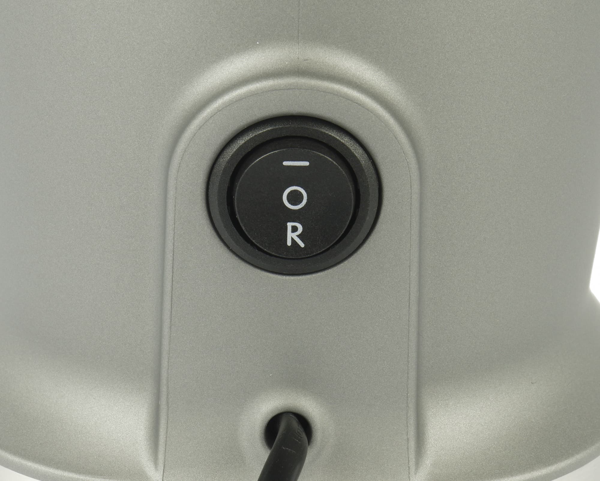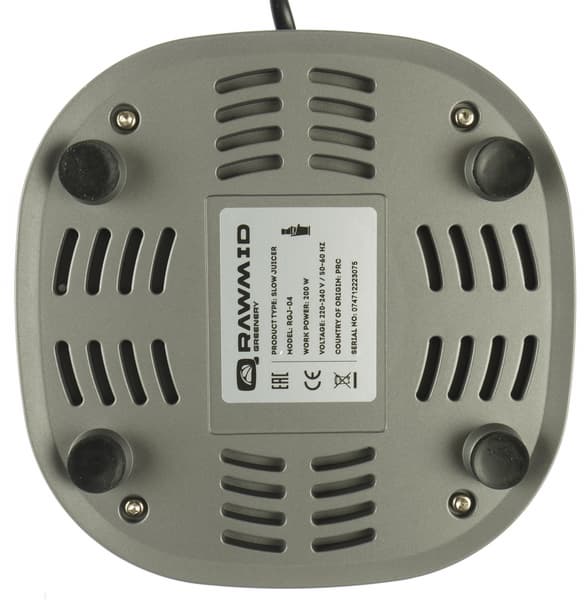 У соковыжималки Rawmid RGJ-04 управление происходит при помощи механического переключателя. При переключении вверх, в режим «—», включается обычная работа прибора, а вниз, в режим «R», — реверсивное вращение двигателя.