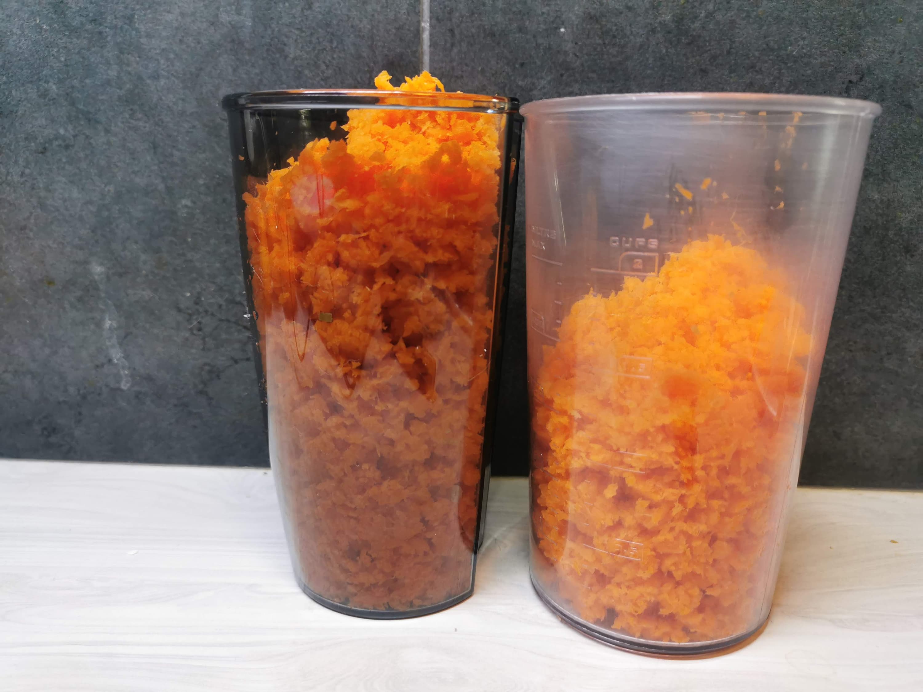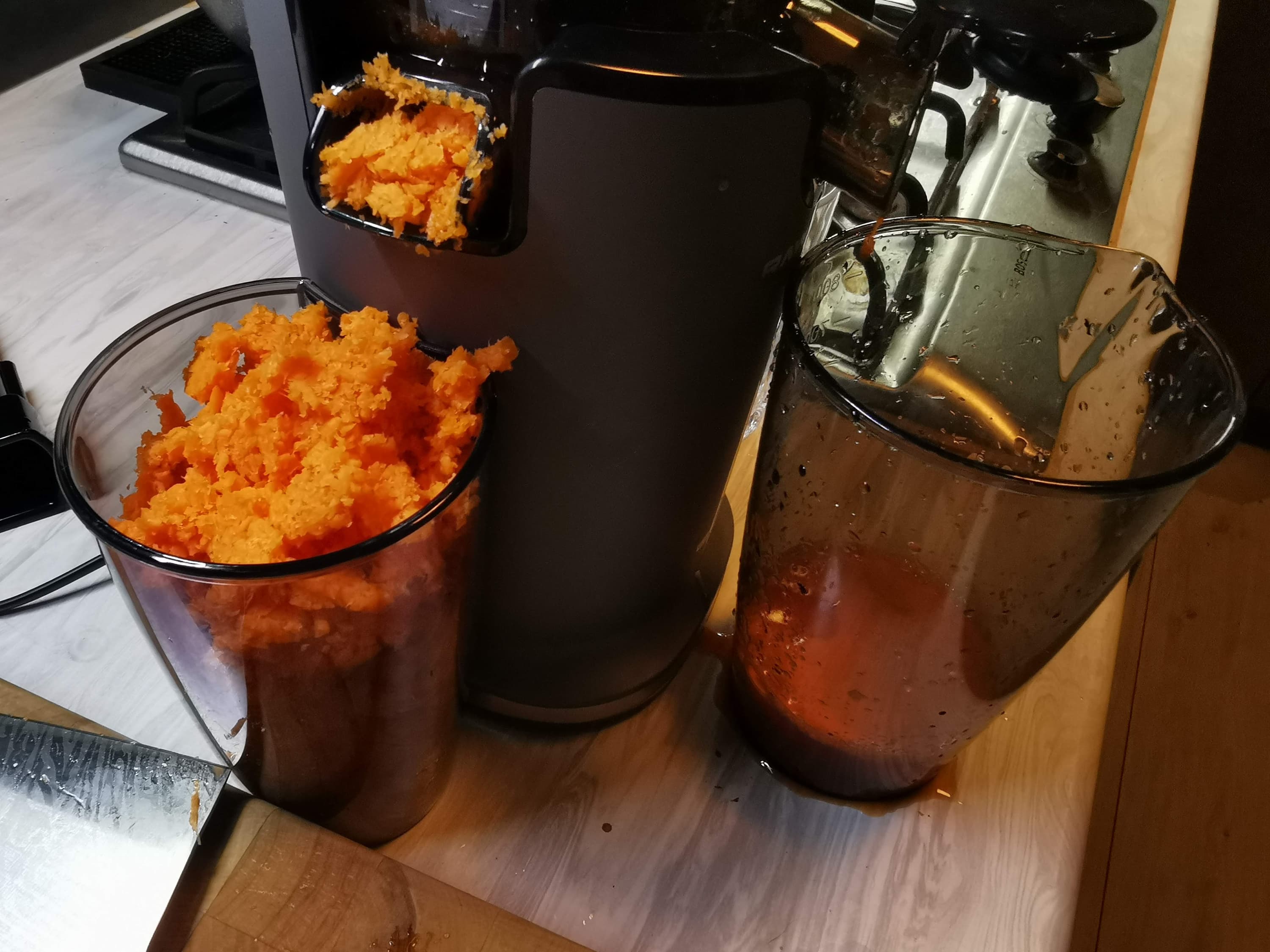 Rawmid RGJ-04 справилась с такой задачей всего за 3 минуты 40 секунд. Вся морковь была ловко переработана и разделена на жмых и сок.
