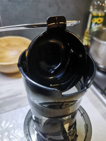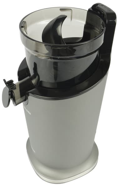 Отверстие для выпуска сока имеет прорезиненный пластиковый клапан с небольшой ручкой. Он приостанавливает подачу сока, благодаря чему можно смешать сок из разных ингредиентов непосредственно в чаше, а также избежать падающих капель при замене емкости для сока.