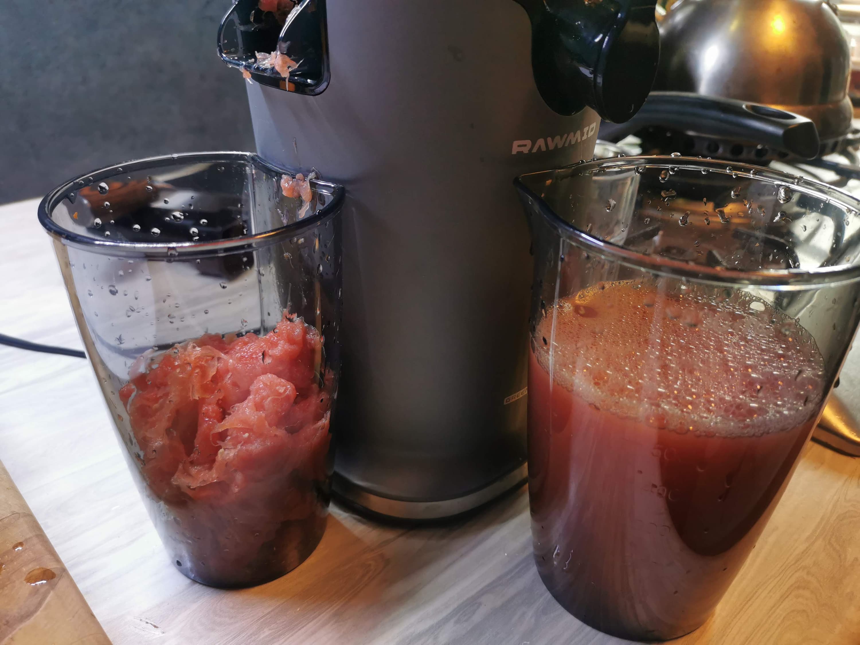 За 3 минуты и 45 секунд все кусочки были активно перемяты шнеком, и мы получили 518 г яркого, ароматного и необычного напитка.