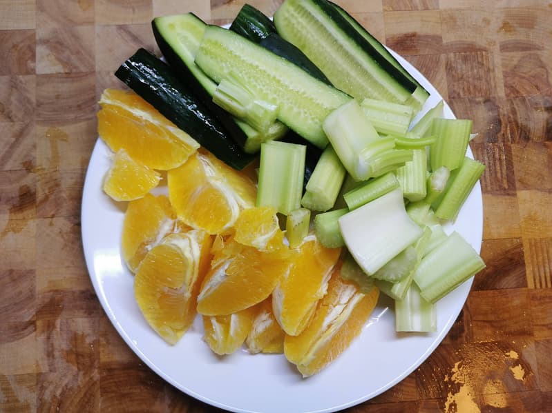 По инструкции такие продукты, как стебель сельдерея, необходимо нарезать на кусочки длиной до 4 см, что мы и сделали. Огурцы мы нарезали вдоль и поперек, а апельсины почистили и разделили на дольки. У нас получилось 897 г подготовленных продуктов.