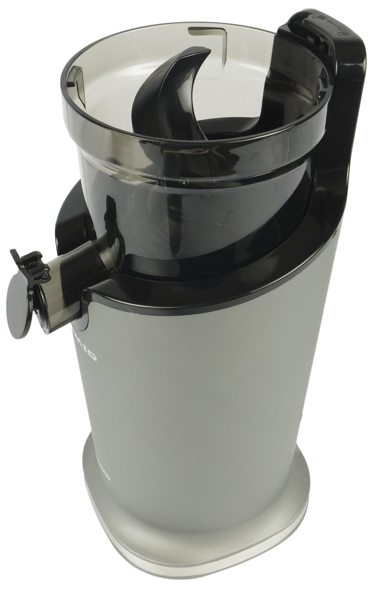 Устройство отличается небольшим диаметром загрузочного отверстия для продолговатых продуктов (всего 3,5×4 см) и возможностью быстро и с удобством загружать широкие кусочки (диаметром до 7,8 см) с помощью переворачивающегося контейнера. Данная модель представлена в двух цветовых вариациях — серебристо-черной и красно-черной, оба варианта выглядят аккуратно и лаконично, имеют компактные размеры, функцию реверса, а также защиту от протекания.
