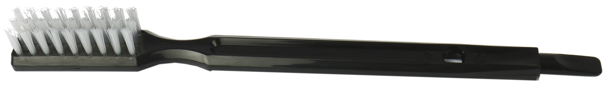 В комплекте к прибору также идет удобная узкая пластиковая щетка черного цвета с жесткой щетиной. Она поможет справиться с застрявшими фрагментами фруктов и овощей в труднодоступных местах соковыжималки и особенно в терке.
