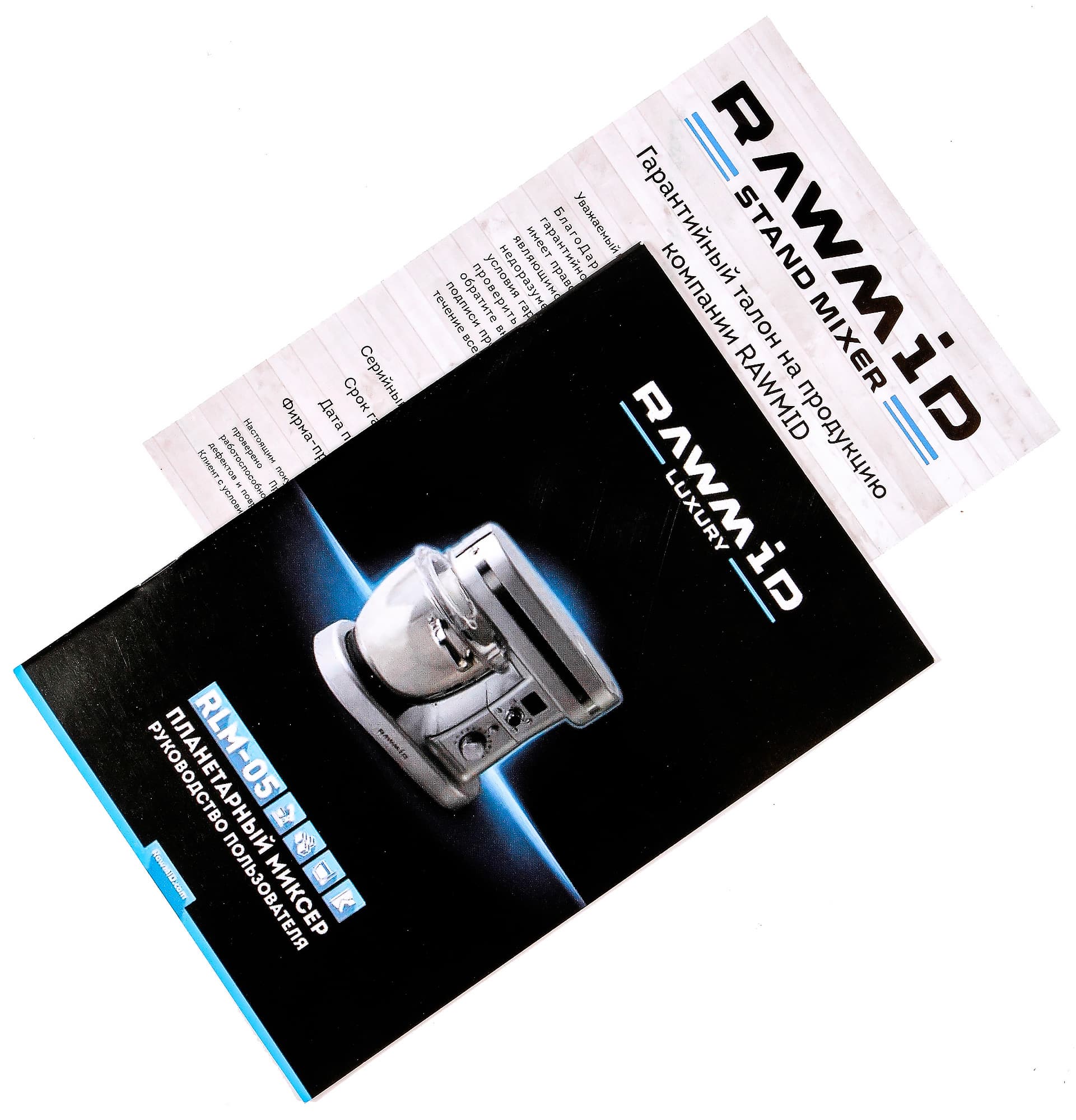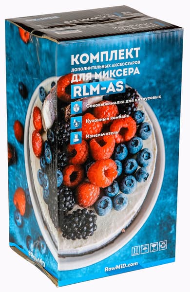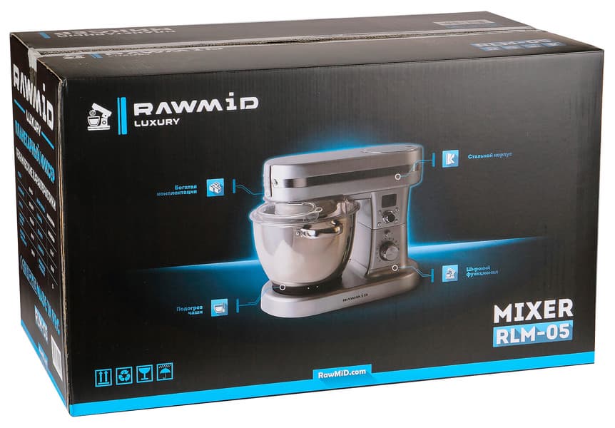 Планетарный миксер Rawmid RLM-05 поставляется в картонной коробке внушительного размера и веса. Дополнительные аксессуары упакованы в отдельную небольшую коробочку. На черном фоне размещена фотография самого устройства и ряда мисочек с яркими свежими ягодами. Изучив текстовую информацию, покупатель может ознакомиться с техническими характеристиками и перечнем особенностей прибора.