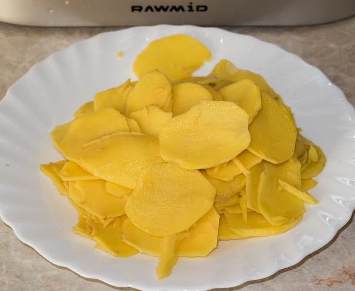 В данном случае нарезку картофеля не назвать «чистой» — встречается много мелких кусочков и обрезков. Поэтому, если предъявляются строгие требования к форме кусочков (жарка во фритюре, например), то нужно отобрать целые слайсы от поломанных и обрезков. Зато целые ломтики получаются тонкие, ровной толщины.