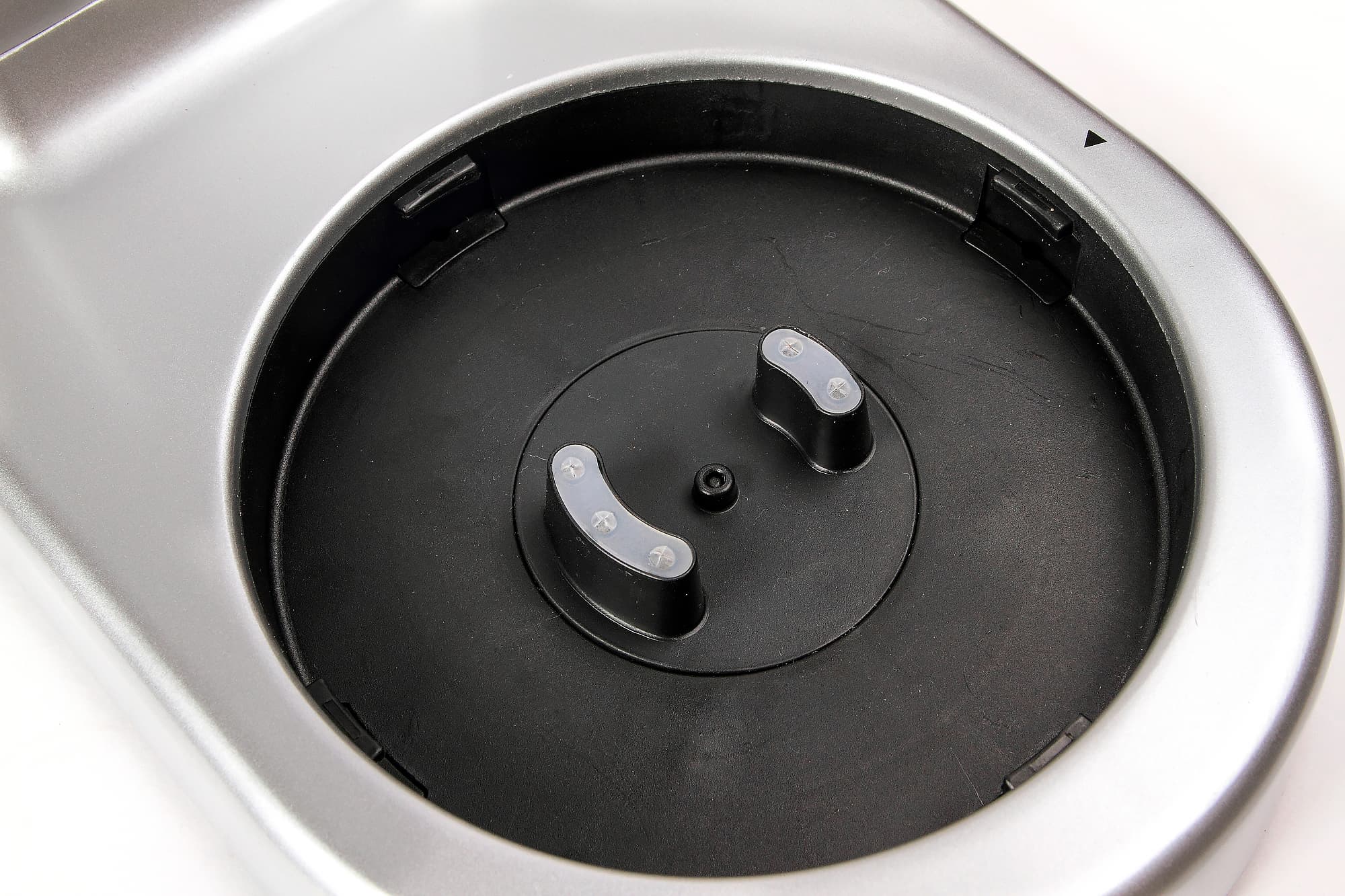 В углубление в основании корпуса устанавливается дежа. Высота гнезда около 2,5 см. По центру под силиконовыми накладками расположены контакты, видимо, нагревателя и термодатчика. На корпусе нанесена отметка для правильного размещения чаши. Блокируется дежа стандартным образом: поворотом против часовой стрелки. Емкость размещается в основании надежно и прочно.
