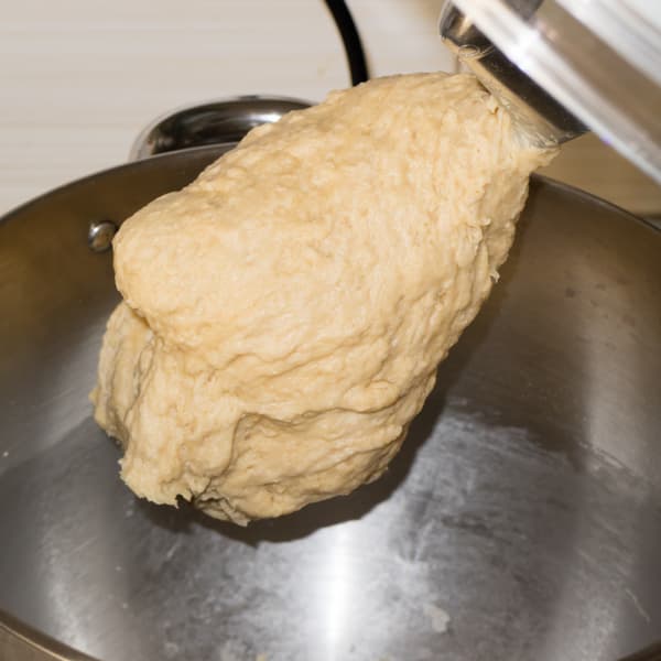 Включили миксер на вторую скорость. Довольно долго, около двух минут, формировался ком теста: крюк не очень активно подхватывал муку со стенок дежи и вмешивал ее в жидкие составляющие. Однако постепенно процесс шел все эффективнее, так что скоро стало понятно, что тесто получается чрезмерно крутым — разрозненные куски теста были обсыпаны мукой и никак не замешивались в единый комок. Влили примерно 30 мл воды. Через пять минут после начала работы миксер смог замесить прекрасное очень плотное однородное тесто, которое не липнет к рукам и свободно отходит от стенок дежи и крюка. Положили его в полиэтиленовый пакет и пока убрали в сторонку.