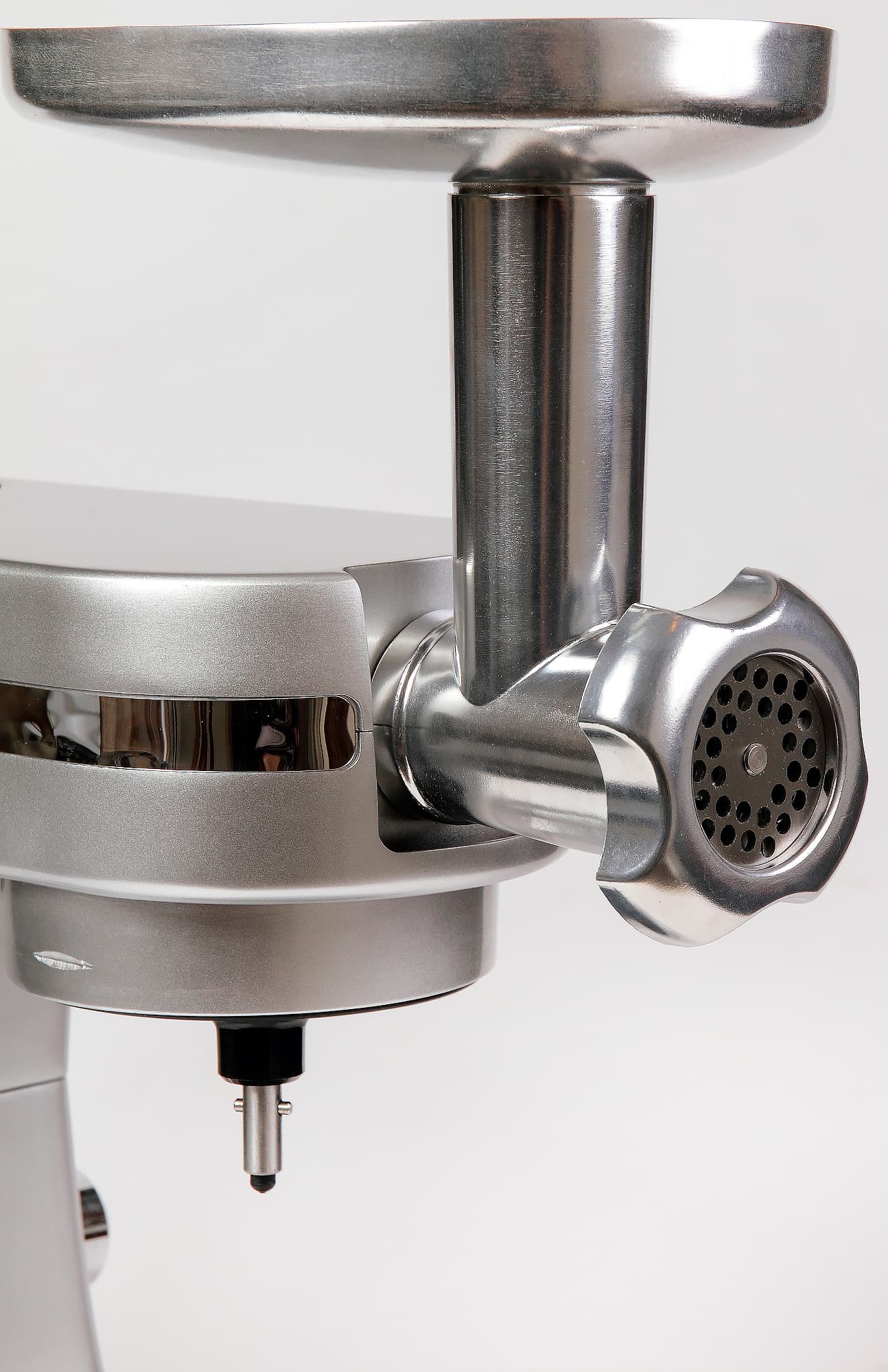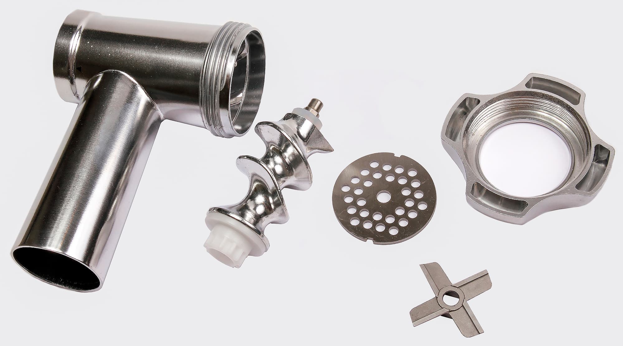 - мясорубка: корпус мясорубки, шнек, силиконовая муфта, нож, три решетки с разным диаметром отверстий, кольцевая гайка, лоток для мяса, толкатель; насадка для сосисок, насадка для фрикаделек (так названо в инструкции, по внешнему виду — насадка для кеббе); круглый фиксатор и металлическая полоса для формования изделий из теста; насадки для изготовления макаронных изделий: спагетти, тальятелле, макарон, лазаньи