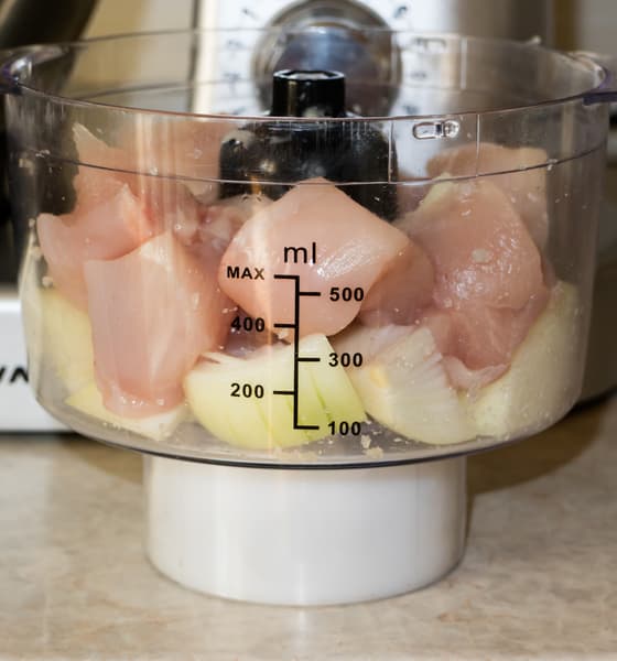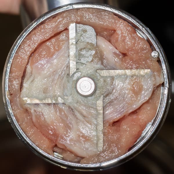 Установили в чашу комбайна S-образные ножи. Измельчали 300 г (как рекомендовано в инструкции) куриной грудки циклами по 5 секунд. Всего для качественной обработки понадобилось три цикла на пятой скорости.