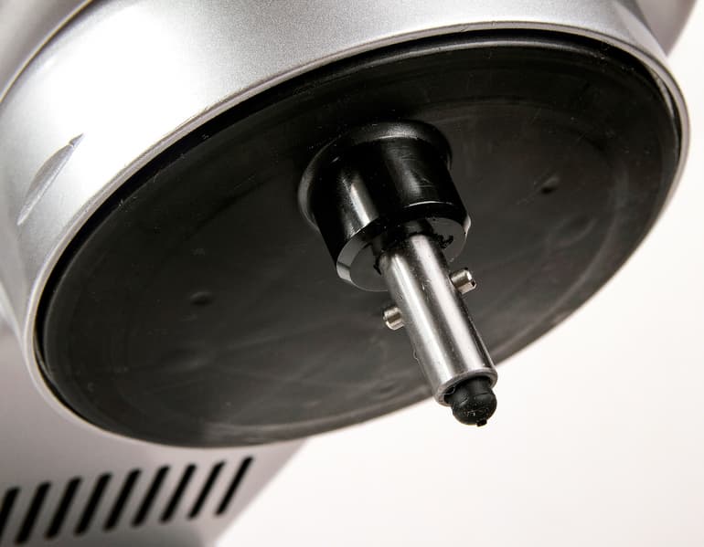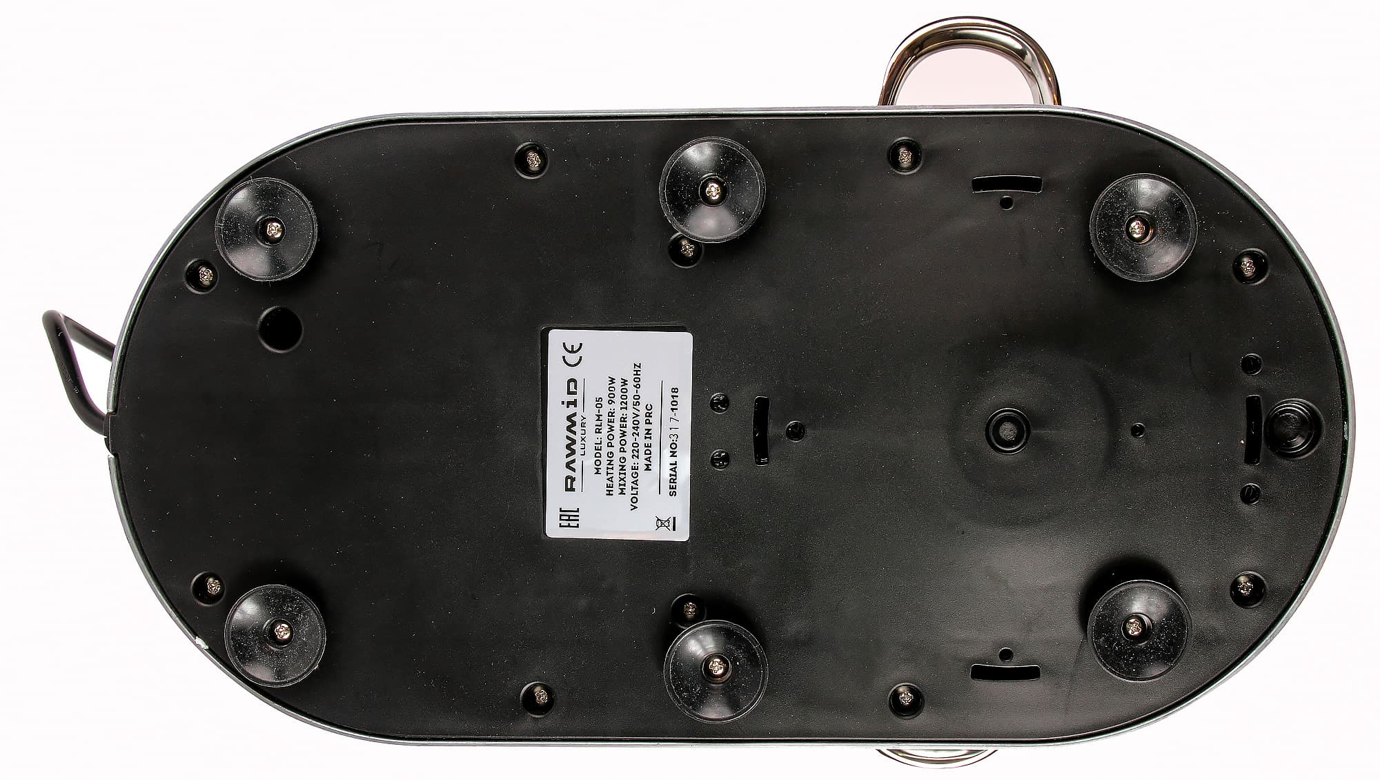 Со стороны дна моторный блок снабжен шестью резиновыми присосками диаметром 3 см. Присоски противодействуют скольжению корпуса во время эксплуатации и гасят вибрации, возникающие при работе на высоких скоростях. К поверхности стола присоски прикрепляются настолько прочно, что сдвинуть прибор с места оказывается довольно трудной задачей. По центру на дне можно видеть наклейку-шильдик с краткой технической информацией о приборе.