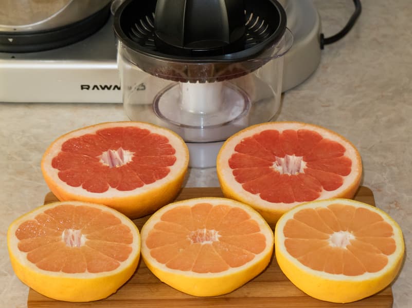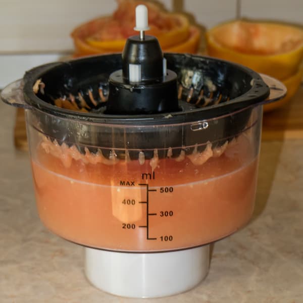 Подготовили ровно один килограммов грейпфрутов. Установили на чашу для комбайна насадку для отжима сока из крупных цитрусовых.