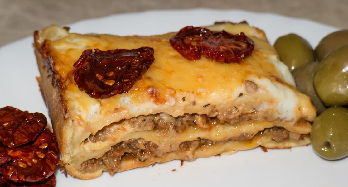 После этого приступили к сборке лазаньи. Налили на дно формы немного белого соуса, положили лист теста, сверху мясной соус, затем — бешамель. Поверх соуса выложили еще один лист теста и повторили всю операцию. Сверху накрыли третьим листом, залили белым соусом и засыпали натертым сыром. Выпекали до готовности на 180 °C.