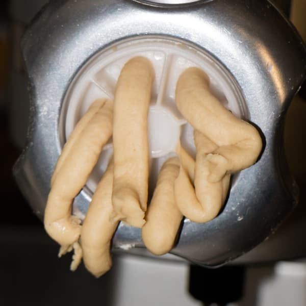 Чтобы понять, насколько удобны насадки для более мелких макаронных изделий, попробовали изготовить макароны. Вставили соответствующую насадку, включили мясорубку на 9-ю скорость, загрузили комок теста и стали надавливать толкателем.
