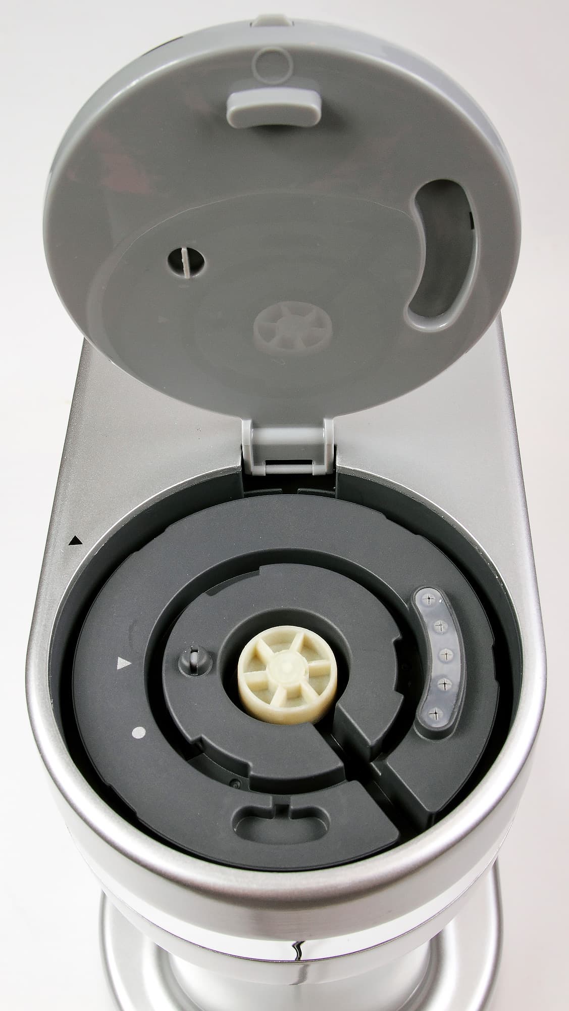 Сверху справа под защитной крышкой находится второй разъем для установки блендера и комбайна (измельчитель, шинковка, соковыжималка). Защитная крышка верхнего разъема открывается при нажатии на кнопку, расположенную здесь же, на крышке. Муфта сцепления изготовлена из прочного пластика. В дальней от пользователя стороне размещены контакты нагревателя и термодатчика, прикрытые силиконовыми накладками.