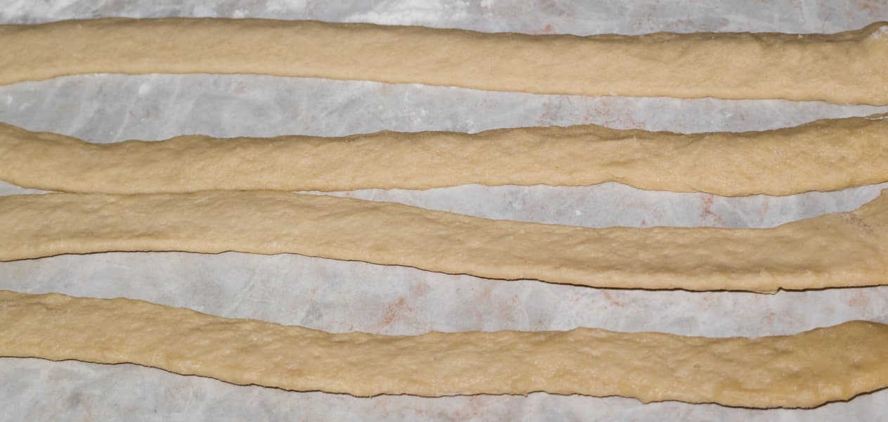 Отверстия для выхода пасты расположены так, что получающиеся пласты не слипалось. При достижении необходимой длины, полоски нужно отрезать ножом.