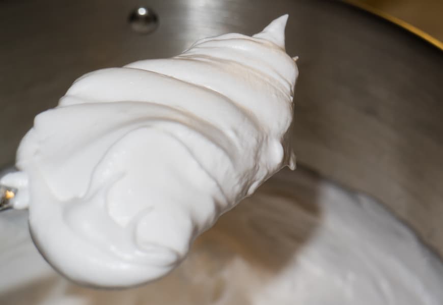 Сварили сироп, дождались, пока он перестанет кипеть, и тонкой струйкой, по стенке (работали без защитной крышки) ввели его во взбитые белки, не останавливая движение венчика. Взбивали массу еще 4 минуты на 9 скорости. В результате получили плотную, однородную, с ровной блестящей поверхностью меренгу.