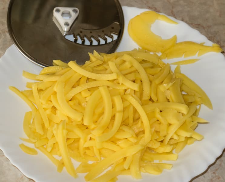 Результаты шинковки этим диском мы оцениваем как весьма хорошие. Соломка получилась в большинстве своем ровная, одинакового размера и толщины, отходов практически нет — нарезан весь картофель. 300 граммов корнеплода, разрезанного напополам, были переработаны на пятой скорости за 37 секунд.